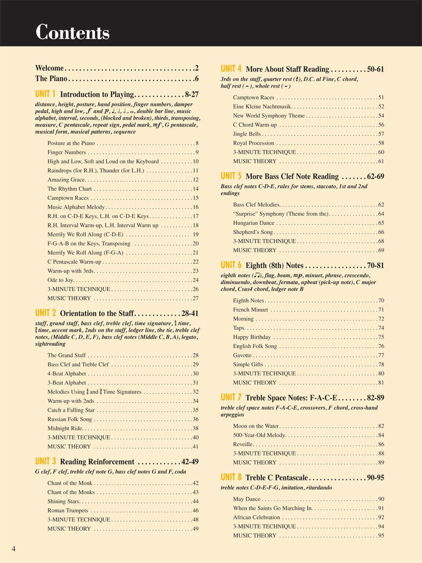 Adult Piano Adventures enables the adult beginner to play music for pleasure while developing musical understanding. This comprehensive “All-In-One” book includes lessons, technique, and theory in a single volume for ease of use. Book 1 presents the fundamentals of music notation, chord playing, and musical form. The redesigned layout improves information hierarchy, putting focus on key concepts and step-by-step learning. Online support is now included, with over two hours of instructional videos and audio accompaniment tracks that inspire rhythmic vitality and artistic expression.