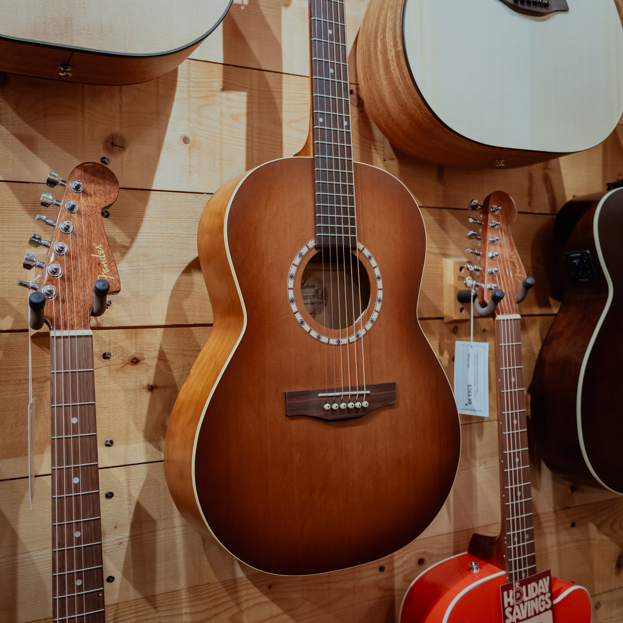 A used but well kept Folk Cedar Antique Burst Left Handed acoustic in great condition. Hardshell case included!