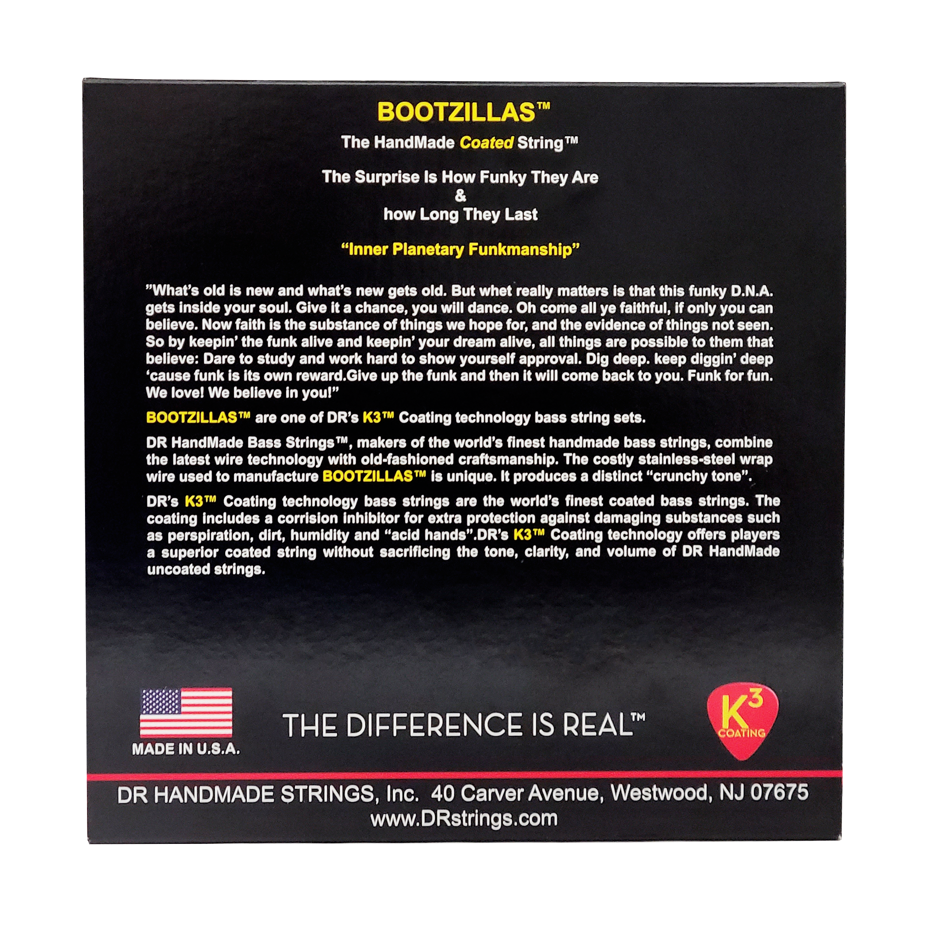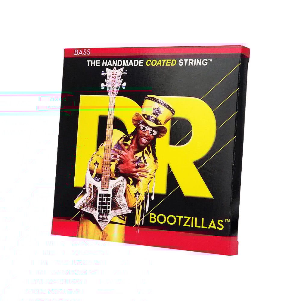 BOOTZILLAS™ bass strings, the signature strings of legendary Bootsy Collins, use a unique stainless steel wrap wire clear coated with DR's proprietary K3™ coating that extends life by protecting against damaging substances like perspiration, dirt, humidity and hand acids. Wound on a hexagonal core wire, the strings product the distinct "crunchy" tone for which the interplanetary funkmaster is known.