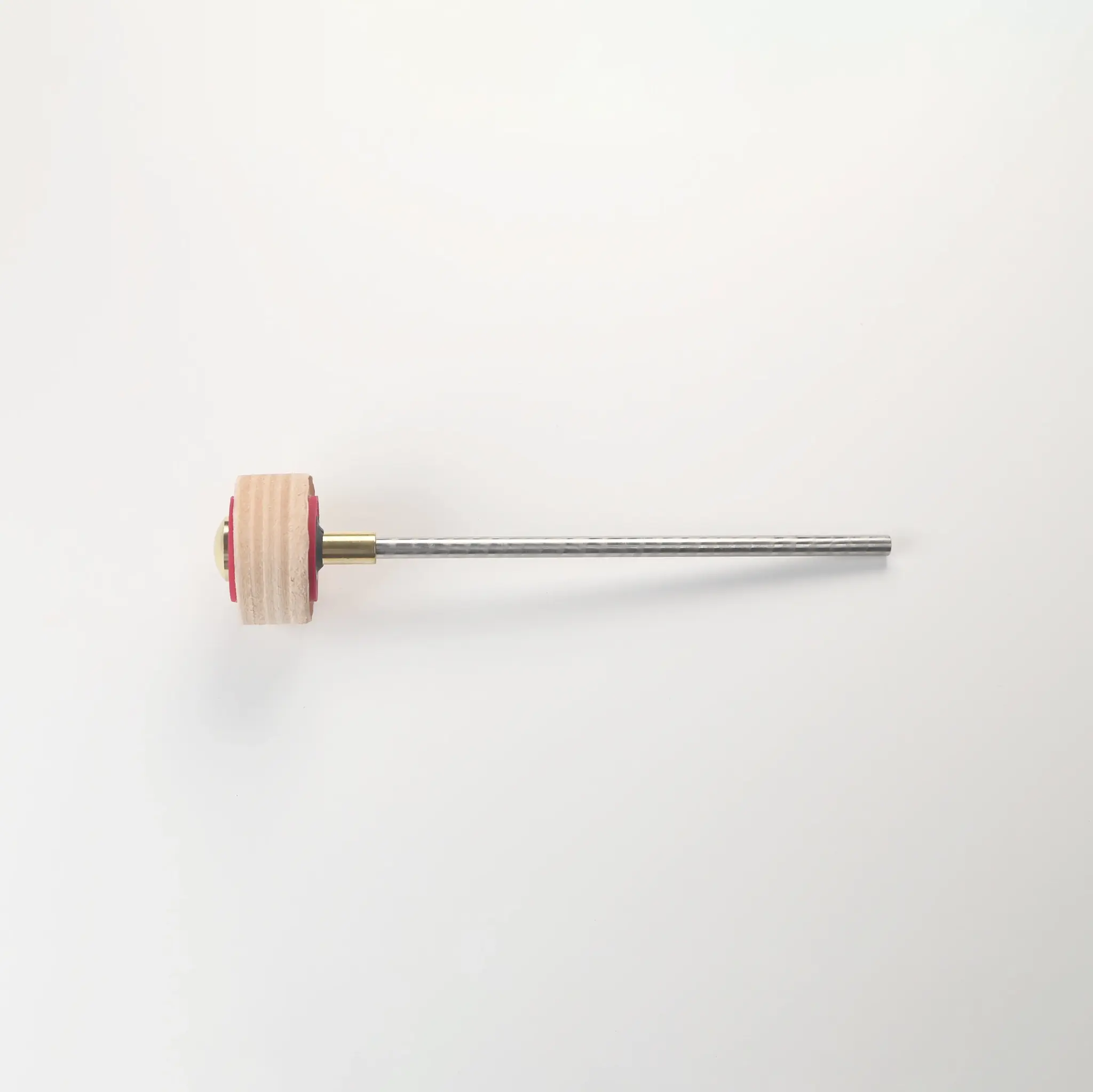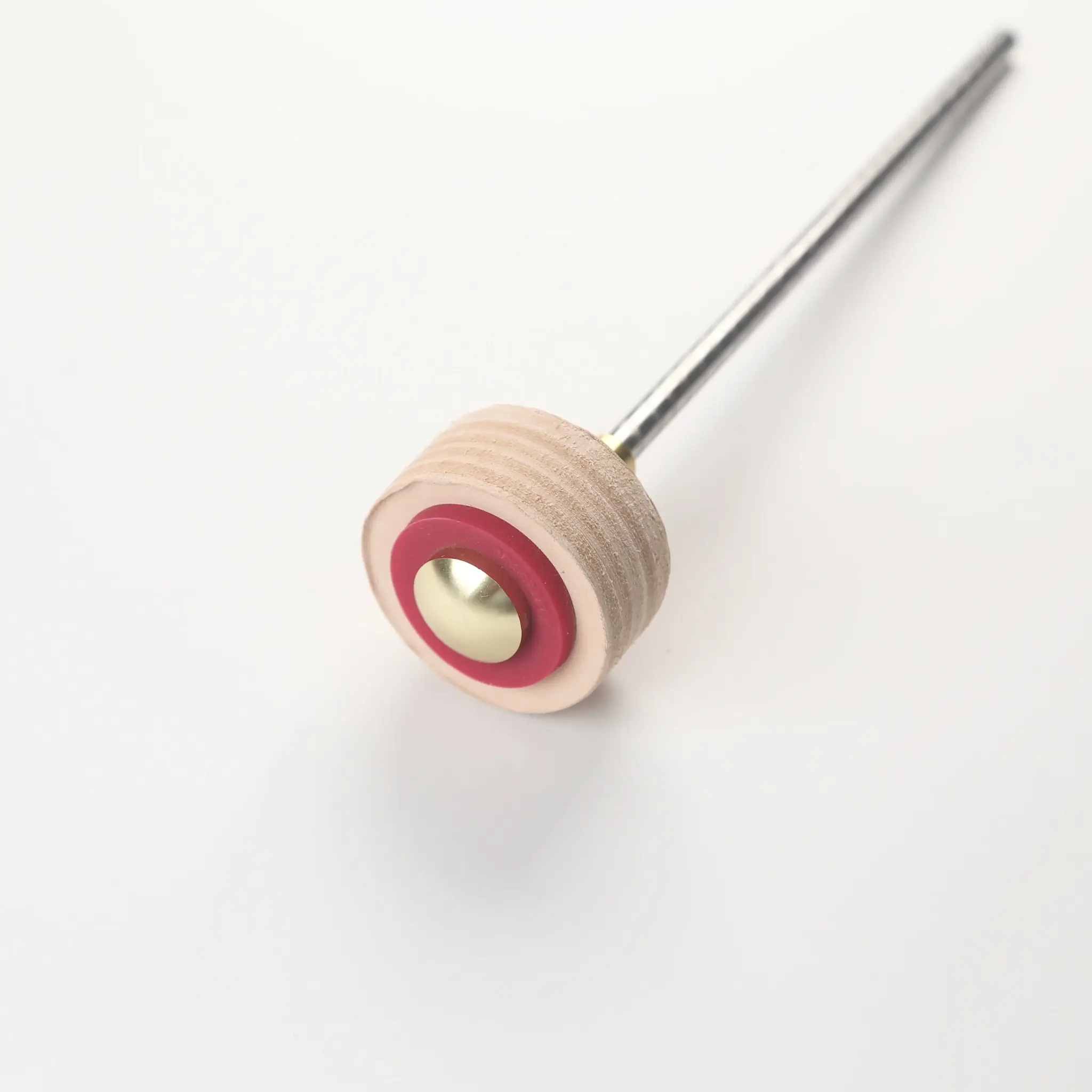 Our hardest beater is constructed of 5 discs of thick, firm leather tightly stacked together on a brass post. This beater is articulate and punchy, but with a warmth and depth to the sound not found in conventional hard felt beaters. Great general purpose beater.