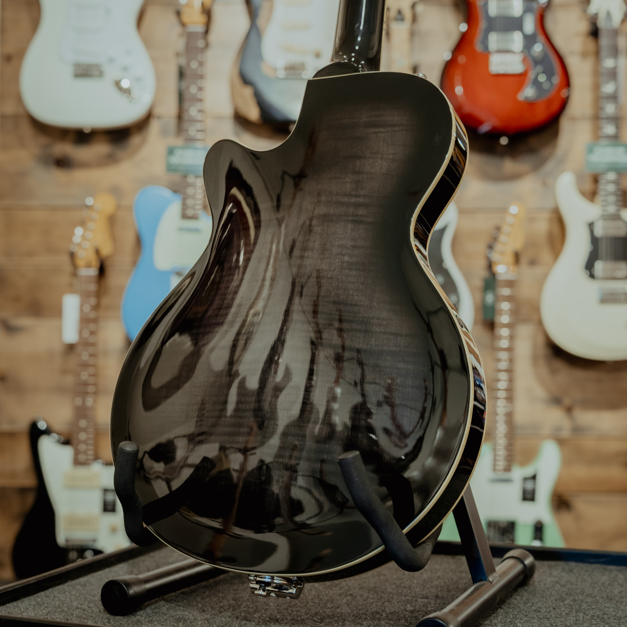 The Starplayer TV brings a beautiful laminated spruce top. The neck is made from a single piece of maple and the stunning flamed maple back elegantly shines through the black burst finish on the back.