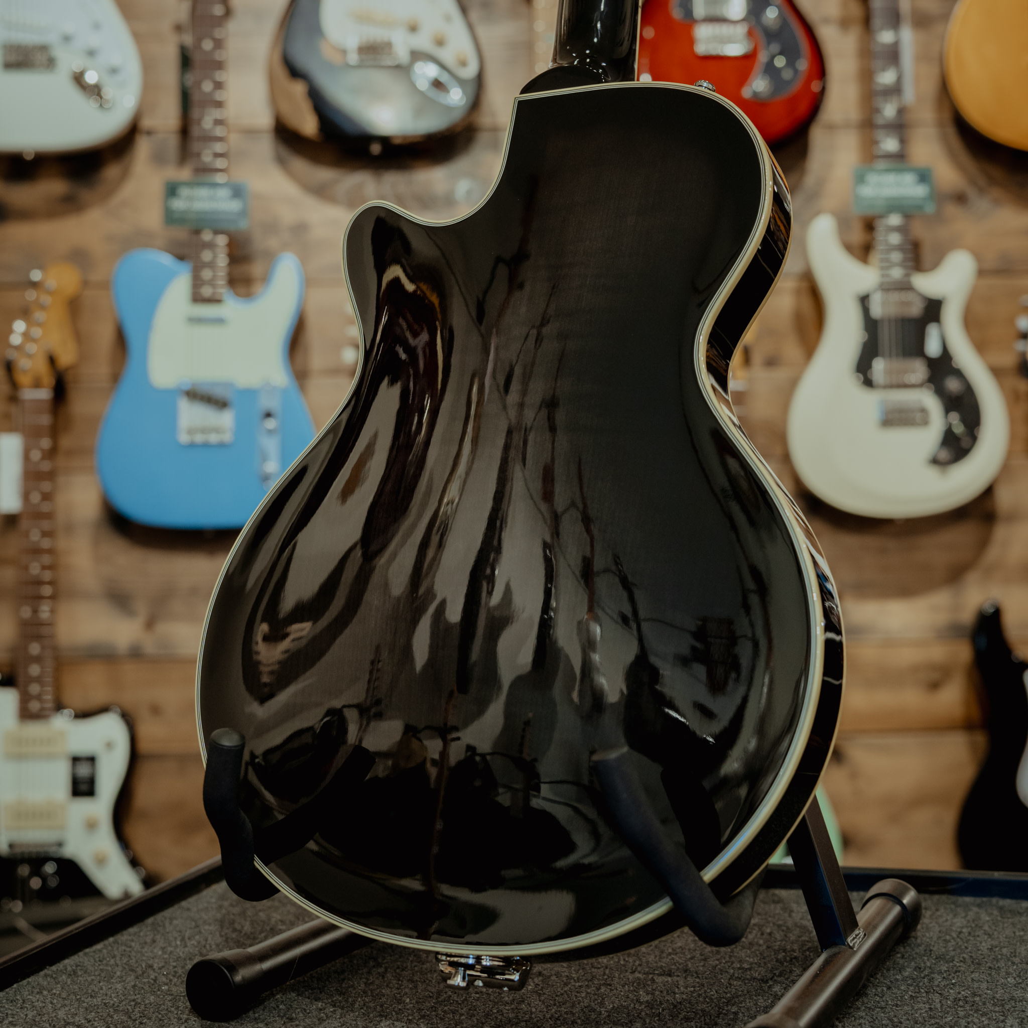 The Starplayer TV brings a beautiful laminated spruce top. The neck is made from a single piece of maple and the stunning flamed maple back elegantly shines through the black burst finish on the back.
