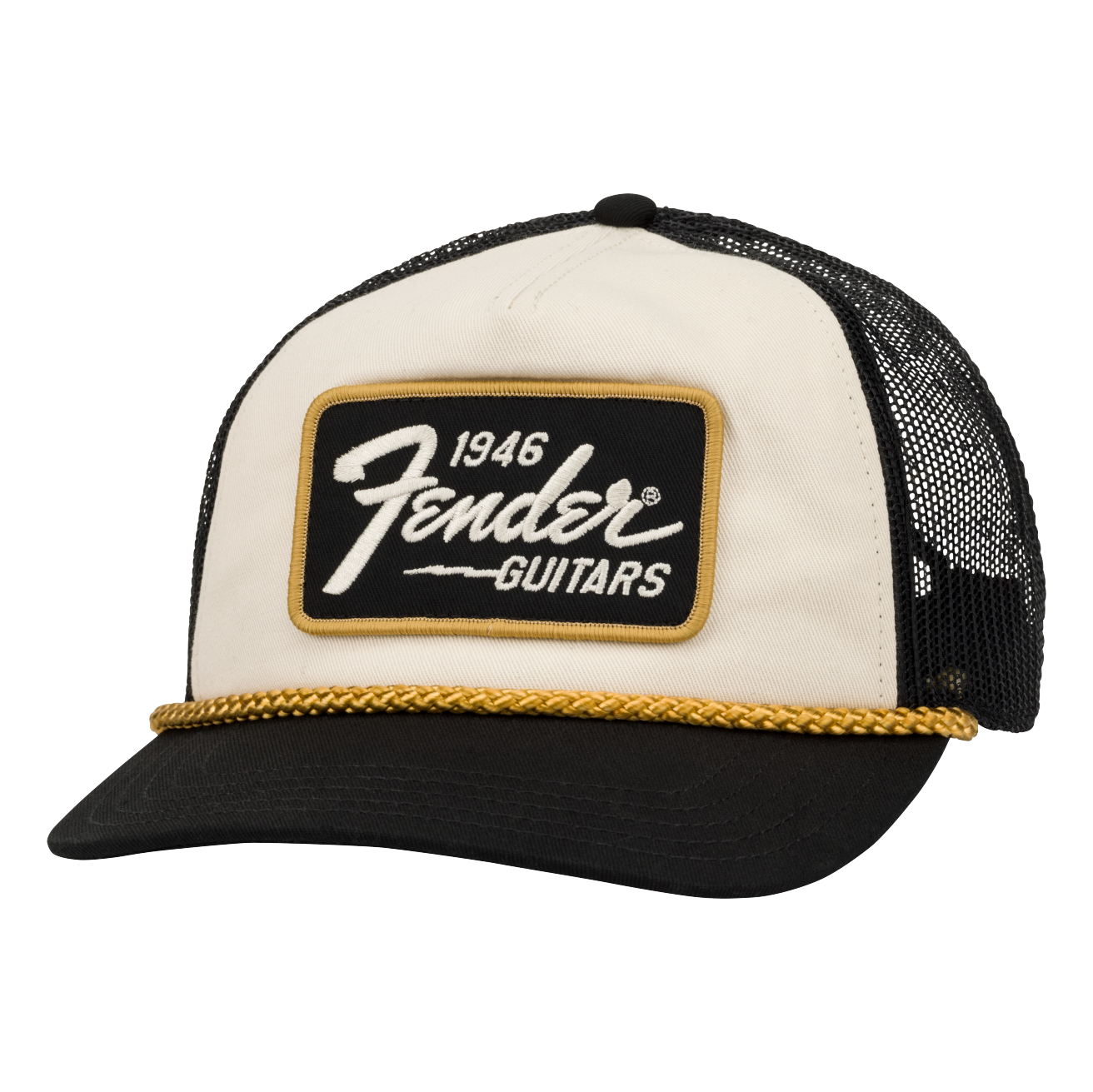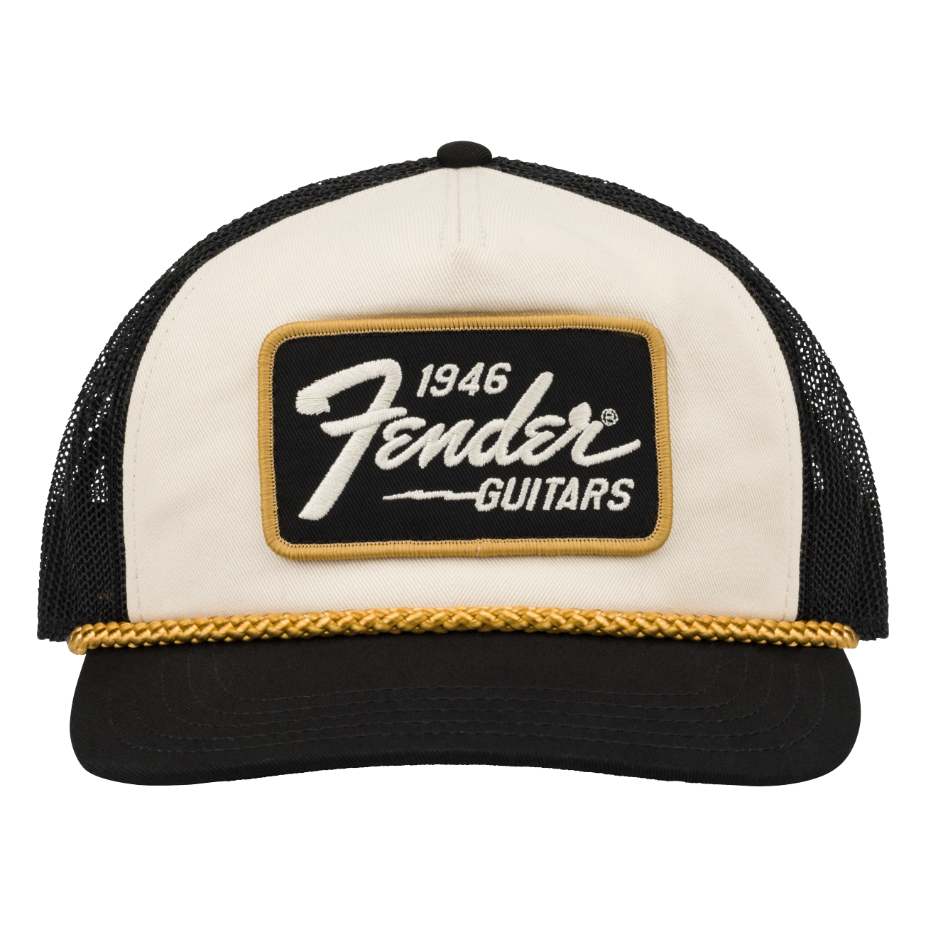 Go old school in this Fender fan favorite 5-panel, gold braid, cream front hat. Featuring a,"1946 Fender Guitars" embroidered patch you will be kicking it in true retro fashion. On stage, in the studio or hanging with friends your new Fender hat will be the showstopper! Made from high quality materials this hat will be your go to headwear piece.