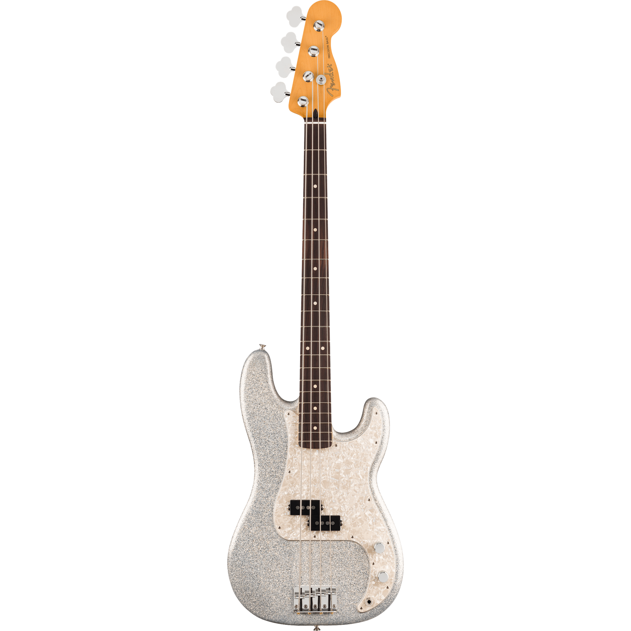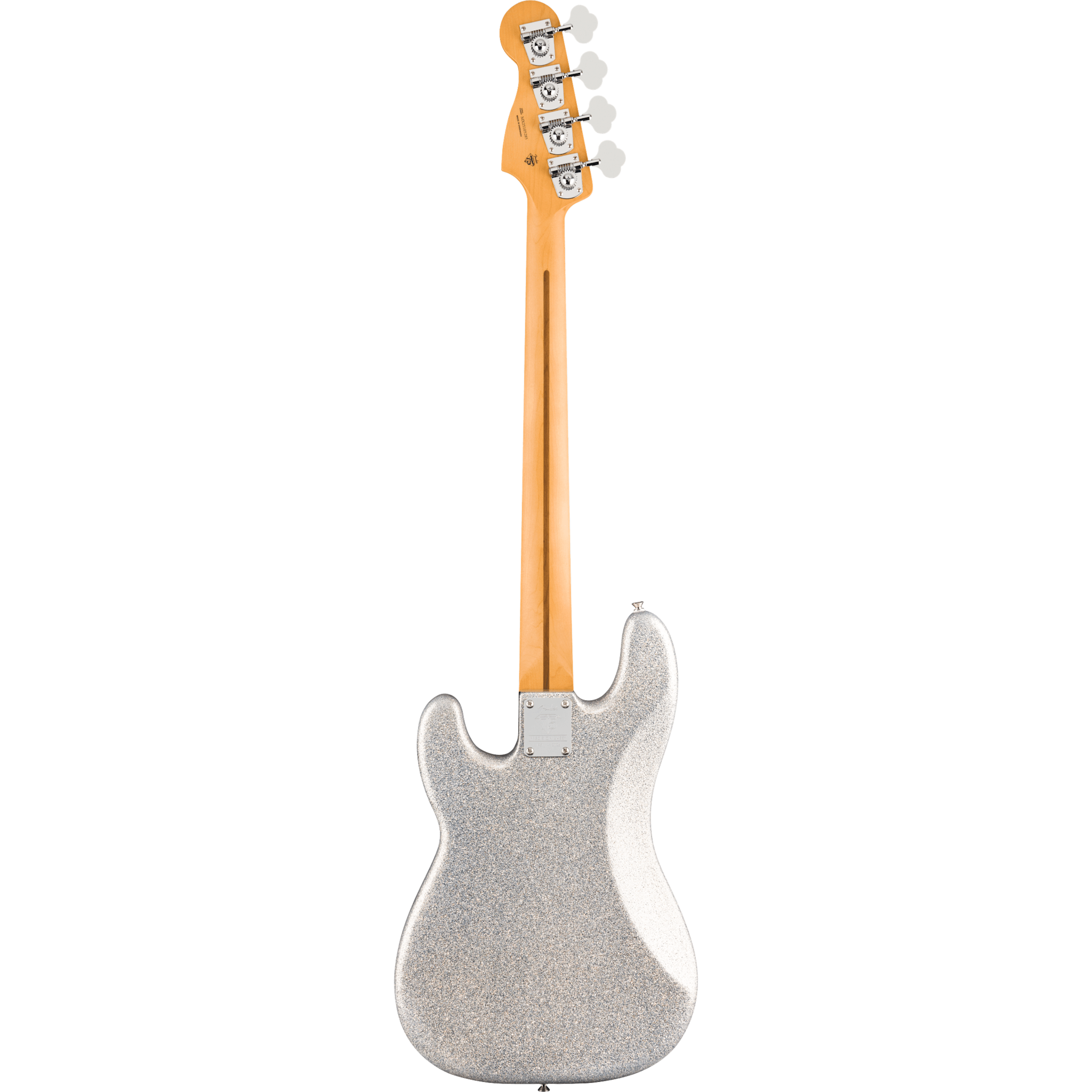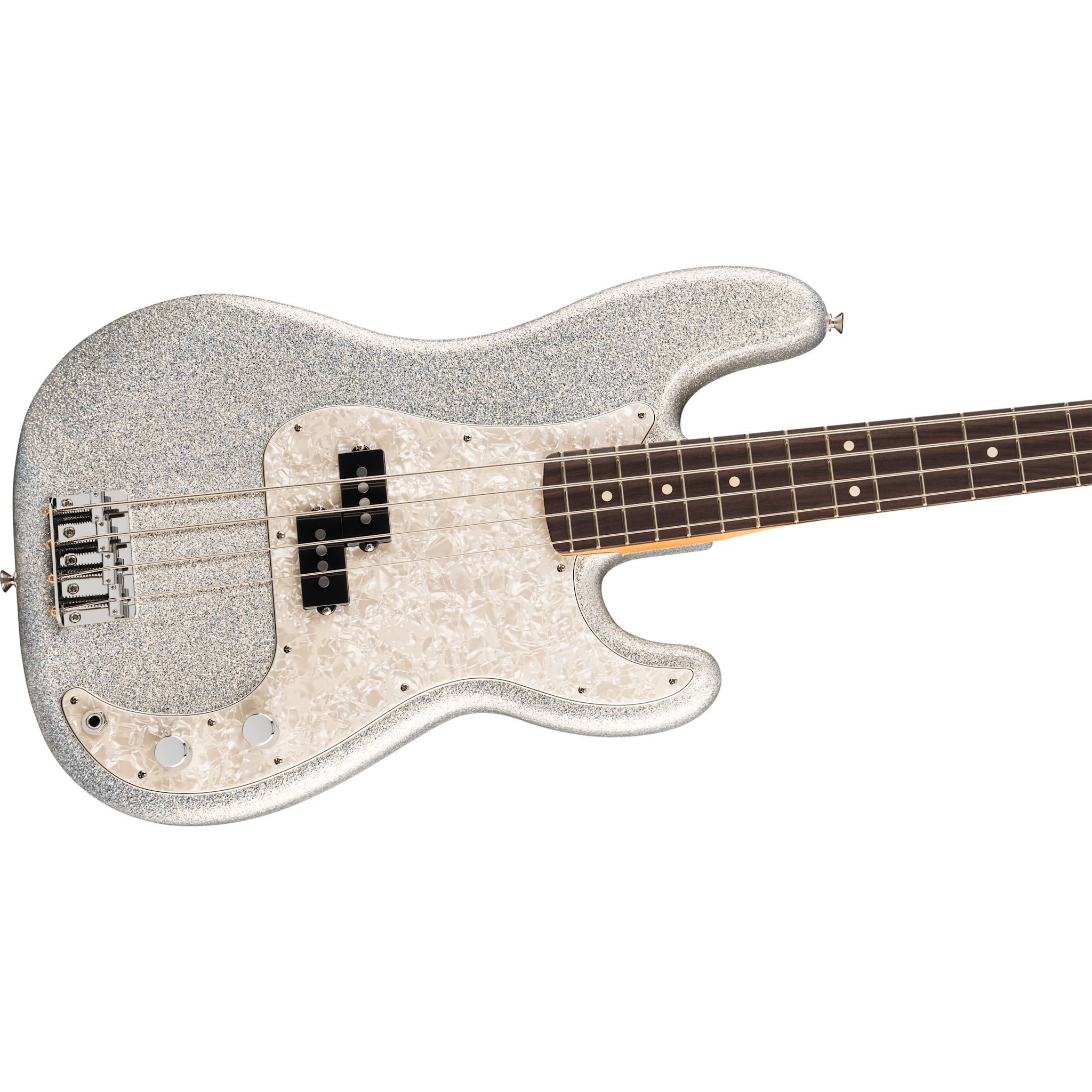 Experience modern craftsmanship with a touch of sparkle in the Player II Precision Bass. Crafted with a resonant alder body finished in eye-catching Diamond Dust Sparkle, this instrument delivers both style and substance. The Modern "C" shaped maple neck with 9.5" radius rosewood fingerboard, rolled edges, and medium jumbo frets provide the smooth, comfortable playability that today's players crave. The 75th Anniversary Thunderbolt™ Precision Bass® pickup delivers rich, powerful tones with enhanced clarity and punch that cuts through any mix. Other quality appointments include a 4-Saddle Bridge with Single-Groove Steel “Barrel” Saddles, open-gear tuning machines and a 4-ply pearloid pickguard with chrome hardware throughout. This exceptional 75th Anniversary Player II Sparkle Precision Bass combines contemporary appointments with a premium sparkle finish, perfect for players who want to stand out while delivering that legendary P-Bass sound.