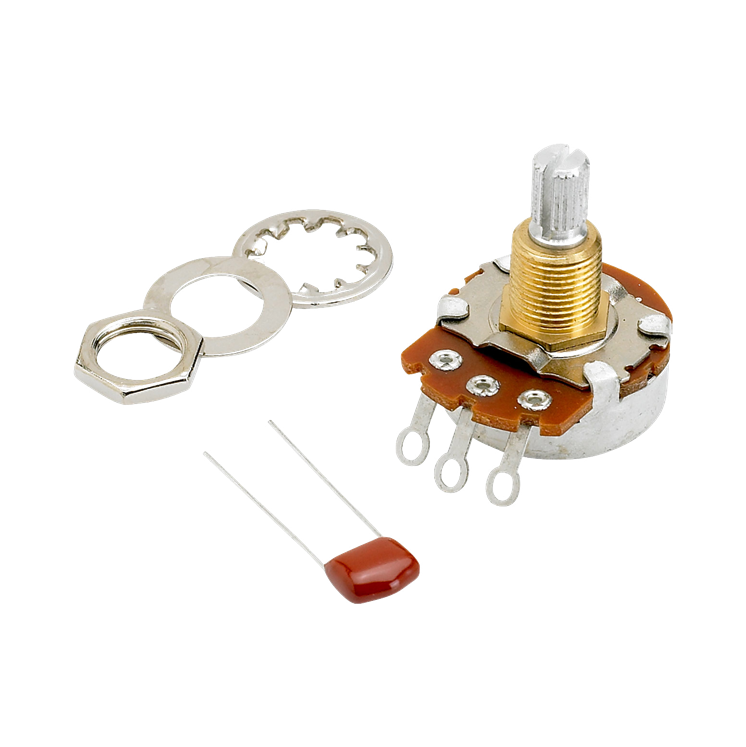 3/8" potentiometer shaft. Split shaft design. Works with push-on style knobs (no set screw). Mounting nut, washer, and .022mf 250V capacitor included.