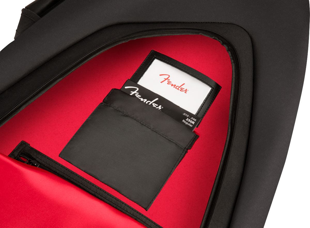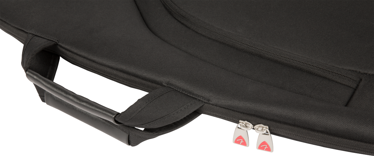 Fender's F610 Series gig bag is a stylish and affordable way to keep your electric guitar safe while traveling. Featuring our iconic asymmetrical Fender shape, its durable outer layer is constructed of tough 600 Denier polyester that protects against impacts while avoiding ripping and tearing. Its interior is filled with 10mm padding and lined with soft touch microfiber that keeps your instrument secure while preventing potential finish damage. The F610 gig bag also comes with a comfortable two-piece handle and ergonomic air mesh backpack straps with easily adjustable ladder lock buckles, so you can comfortably carry your instrument without unnecessary physical strain. Plus, the front storage pocket offers additional storage space for small accessories and a business card window.
