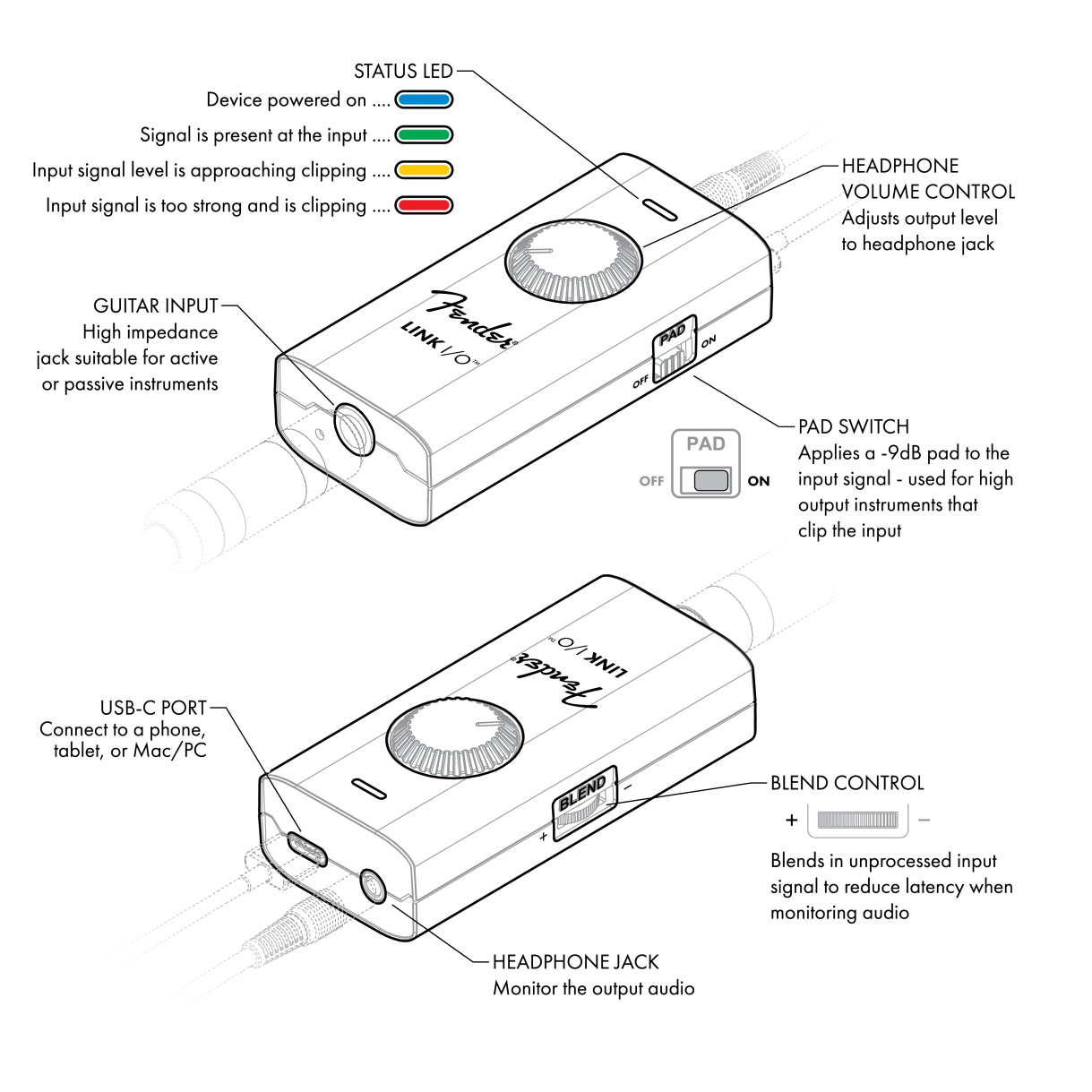 The perfect tool to capture your next riff, the Fender Link I/O™ is a studio-grade audio interface that can fit in your pocket. The Fender Link I/O provides pristine, bi-directional audio over USB connection, making it a one stop shop for connecting your instrument and headphones to your phone, tablet, Mac, or PC.