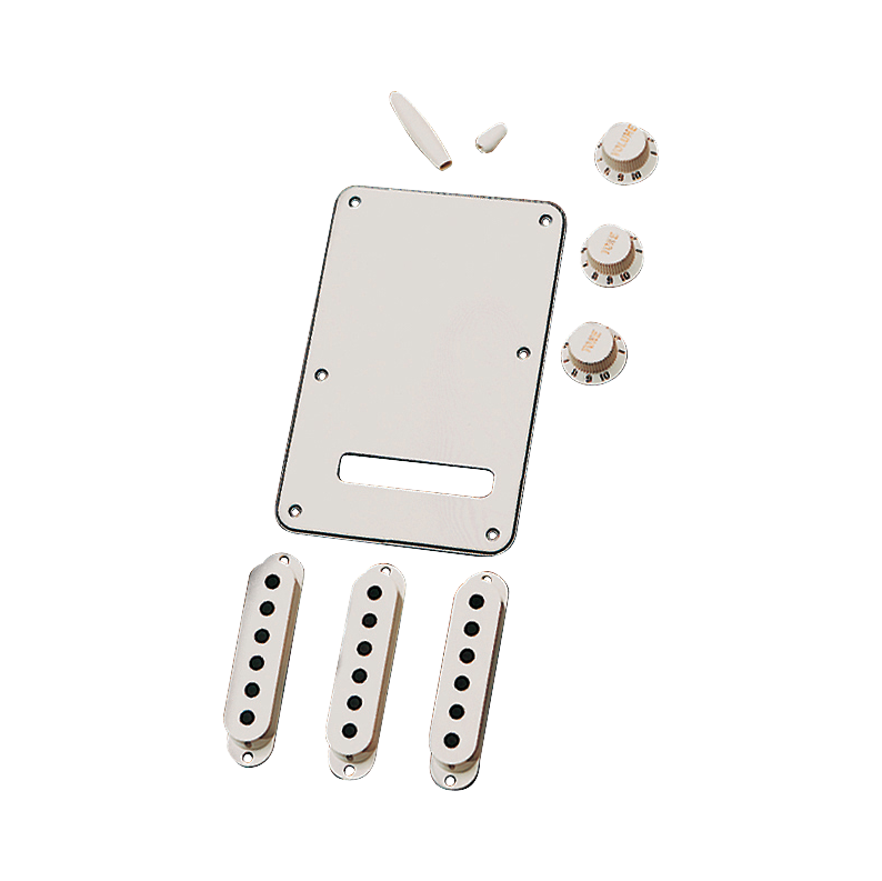 - Contains volume and tone control knobs, pickup switch tip and tremolo arm tip, tremolo backplate and pickup covers
