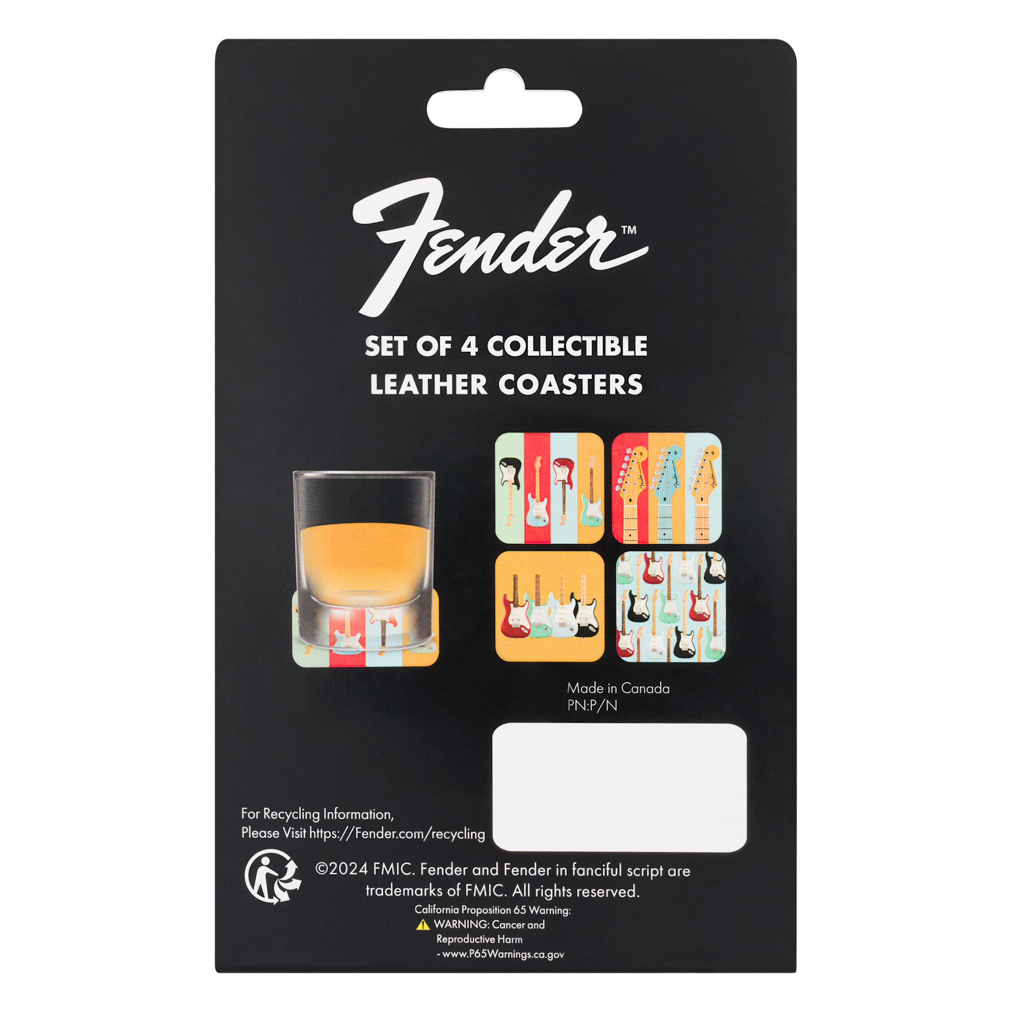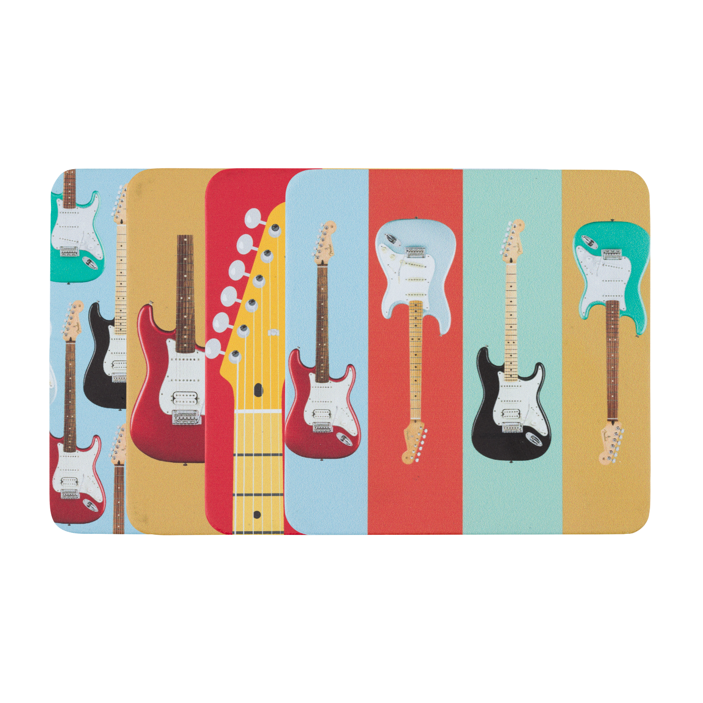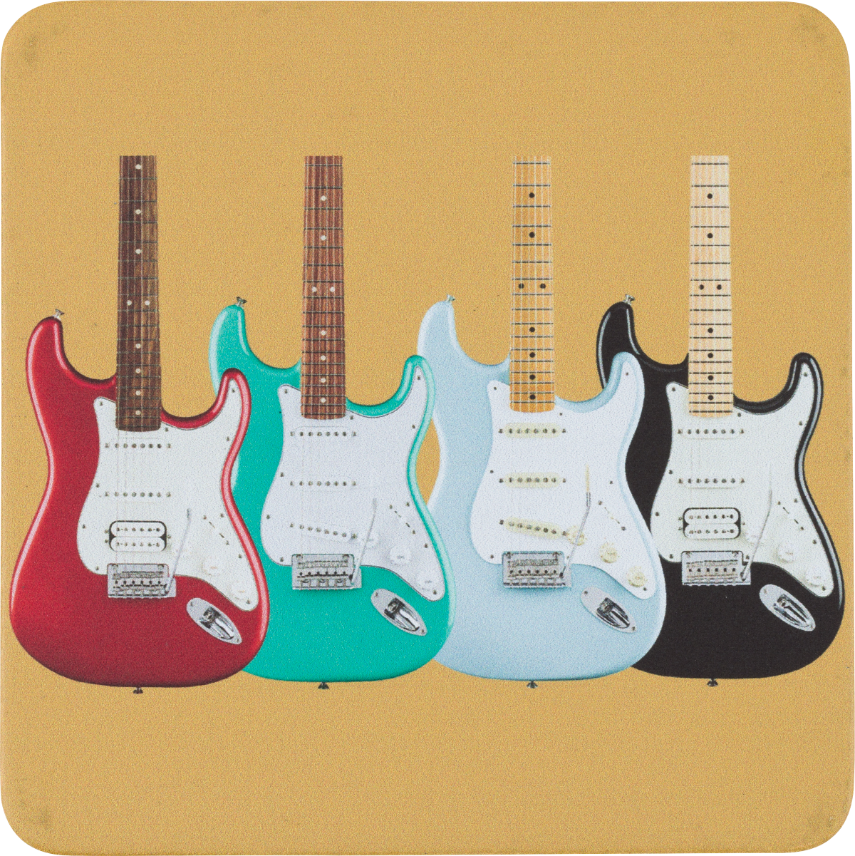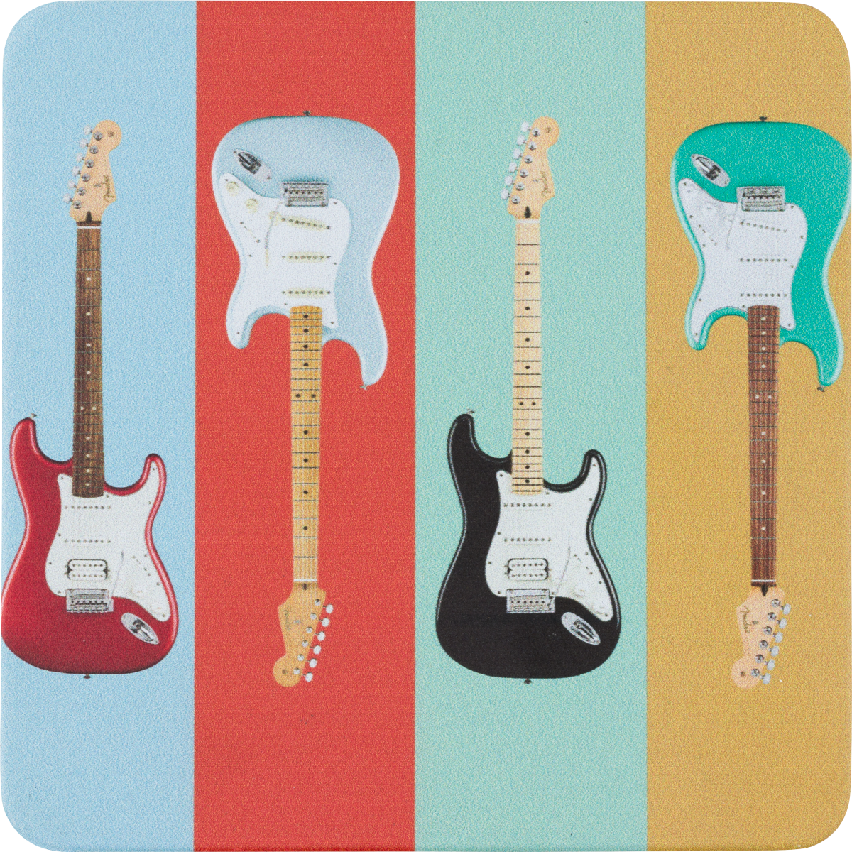 - Set of 4 coasters featuring modern Stratocaster®-inspired designs