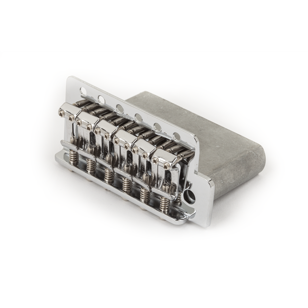 Nickel-plated steel vintage-style bridge assembly with six bent "Fender" stamped saddles. Assembly includes saddles, intonation screws/springs, and saddle height adjustment screws. Tremolo block will accept standard 10/32 thread tremolo arm. Does not include mounting hardware, tremolo claw, tremolo springs or tremolo arm.