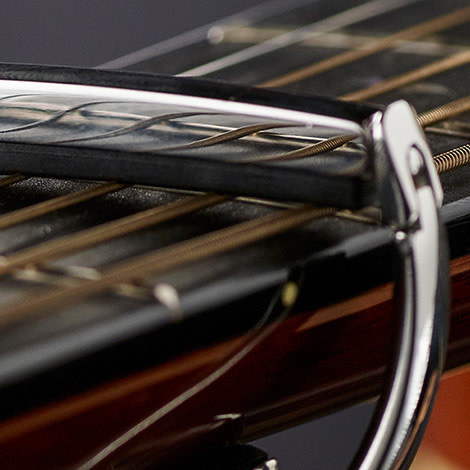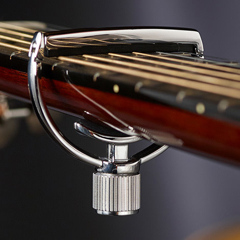 A traditional yoke-style guitar capo that you can store behind the nut on your instrument between songs, designed to look subtle yet beautiful when on your guitar. Popular because the force is exerted from the centre of the neck for excellent pressure distribution, and its low profile shape.