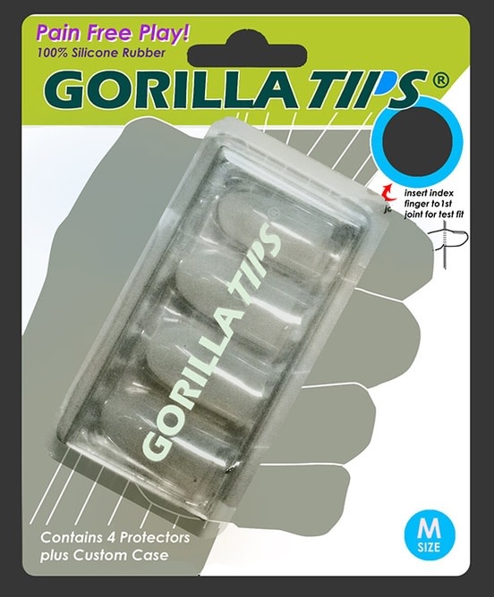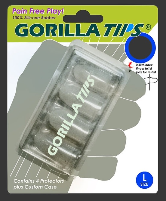 Gorilla Tips are the ultimate solution for sore fingers, experienced when learning to play a fretted instrument such as guitar, banjo, mandolin, or 'ukulele. The patent-pending design is engineered to have thicker material at the tip, which diminishes to a thin, stretchable perimeter for comfortable, flexible fit. A precision-molded transitional tool, each set comes with four washable, reusable, durable fingertip protectors that the player places over the tips of the fingers that touch the fretboard, allowing for hours of pain-free playing!