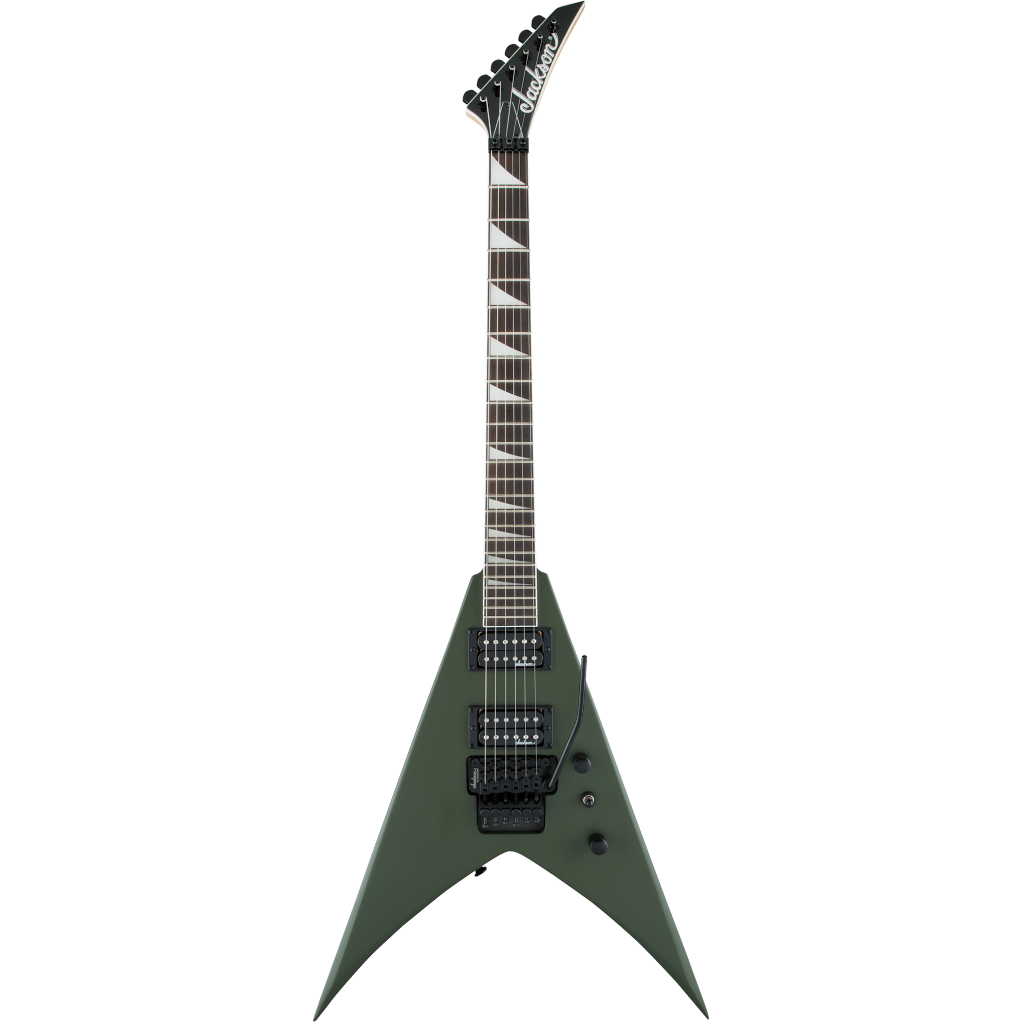 Other features include dual Jackson high-output humbucking pickups with ceramic magnets and three-way toggle switching, Jackson-branded Floyd Rose® double-locking tremolo bridge, standard strap buttons and sealed die-cast tuners.