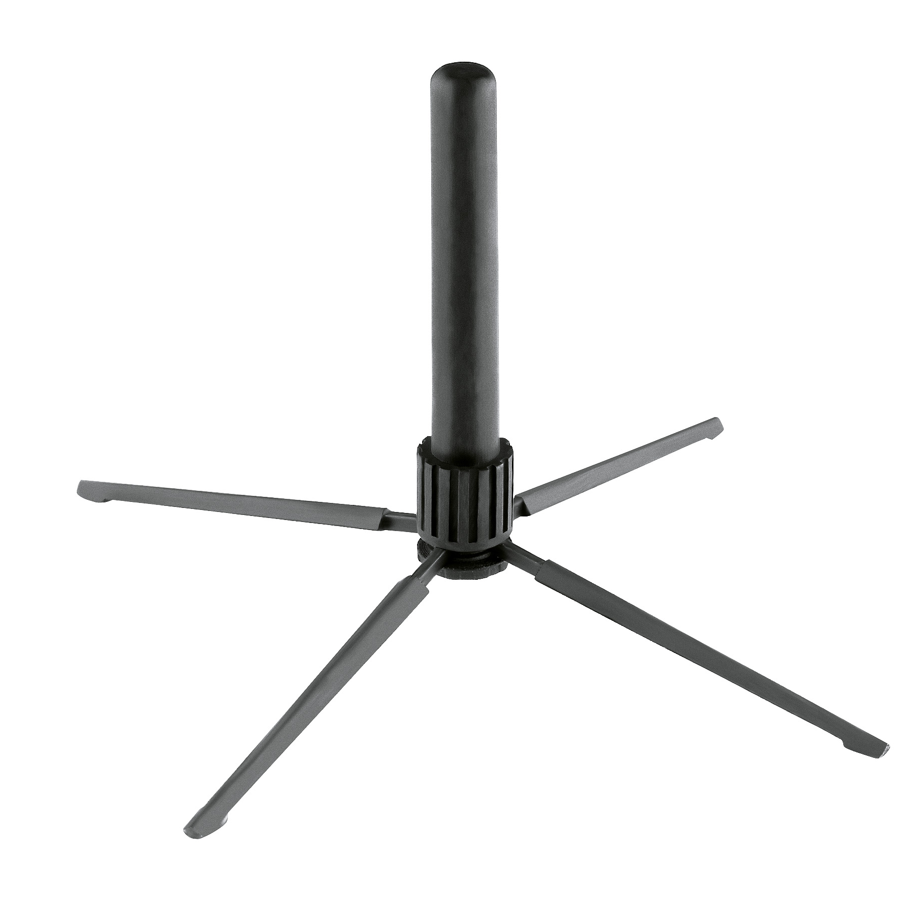 Unique, compact and extremely light flute stand with 4-leg base for Böhm flutes and/or cross flutes. Plastic peg diameter 18 mm. The zinc die-cast legs ensure a very high stability. Folded up the stand fits in almost every pocket.