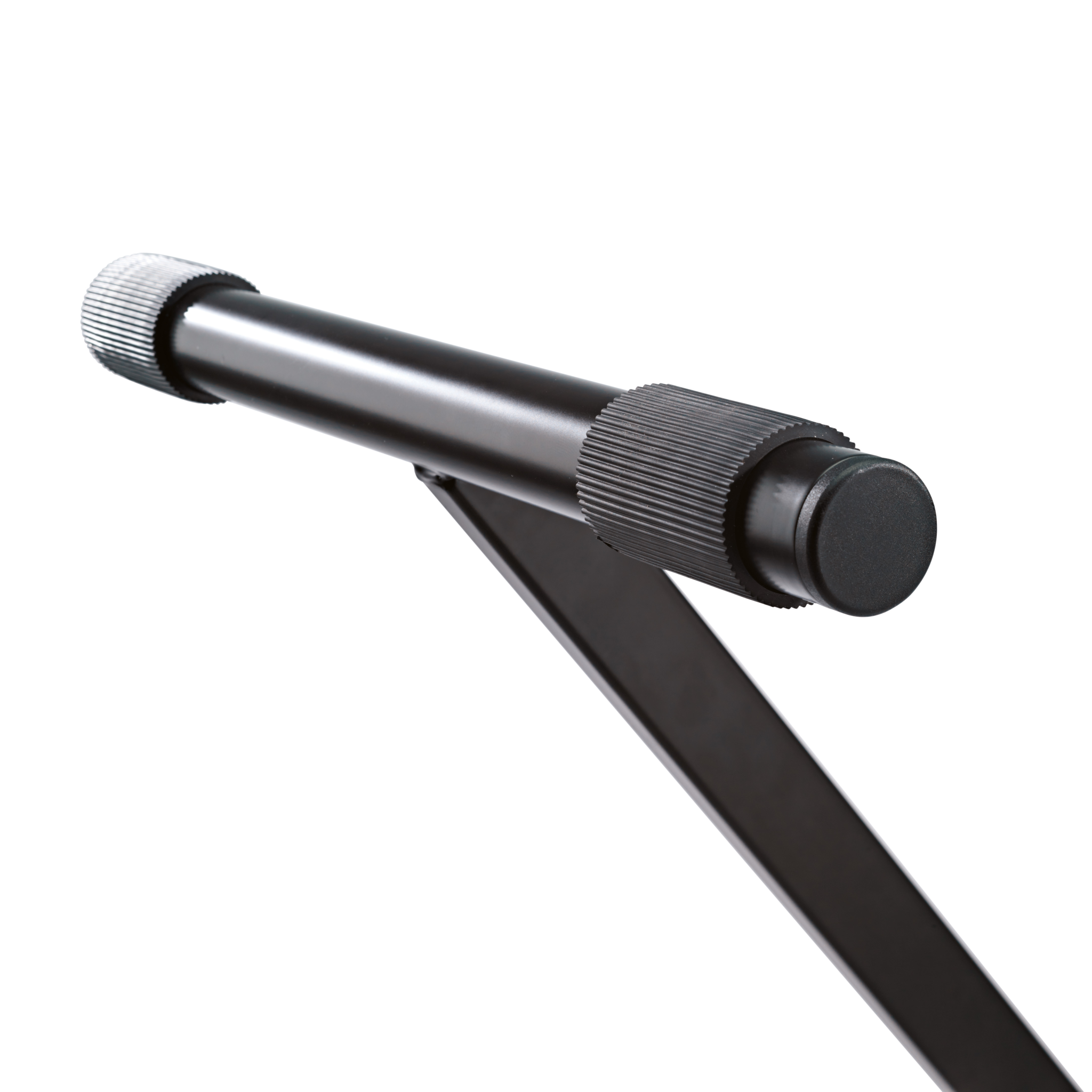 The new generation of X-Stands for stage pianos is comfortable and convenient. The ergonomic clamping mechanism makes setup or break down easy and fast. The robust metal joint can be adjusted in 5° intervals; the short intervals provide the user with a multitude of positions. With the assistance of a scale the user is able to easily find his preferred setting. Both of the back rubber end caps can be adjusted on their axis and as such can be adjusted perfectly to the width of the keyboard. The maximum support depth is 250 mm. The typical K&M quality characteristics, such as solid workmanship, high quality surface finishes and practical end caps to stabilize the stand on uneven surfaces complete off the overall concept.