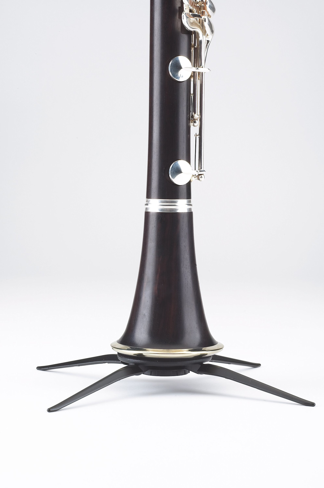 Unique, compact clarinet stand with black plastic peg which fits A, Bb and G clarinets. The 4-leg base provides maximum stability for the instrument. The detachable metal leg base screws into the peg so that the entire unit can be stored in the bell of the instrument. Very handy!
