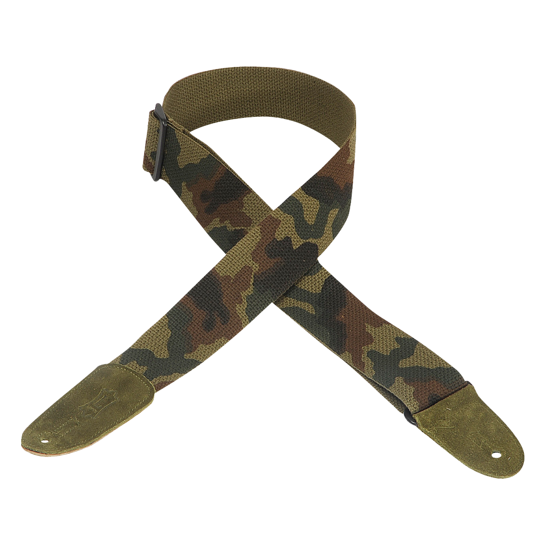 - Levy's 2" Camoflage Cotton Guitar Strap With Two-Ply Forest Green Suede Ends And Branded Logo.