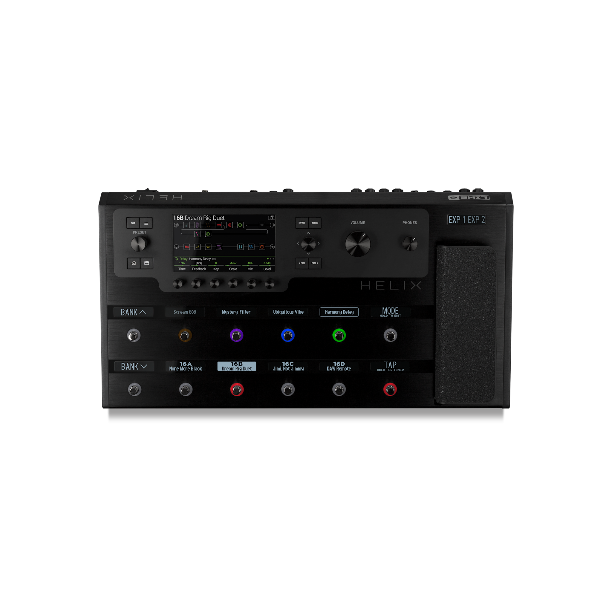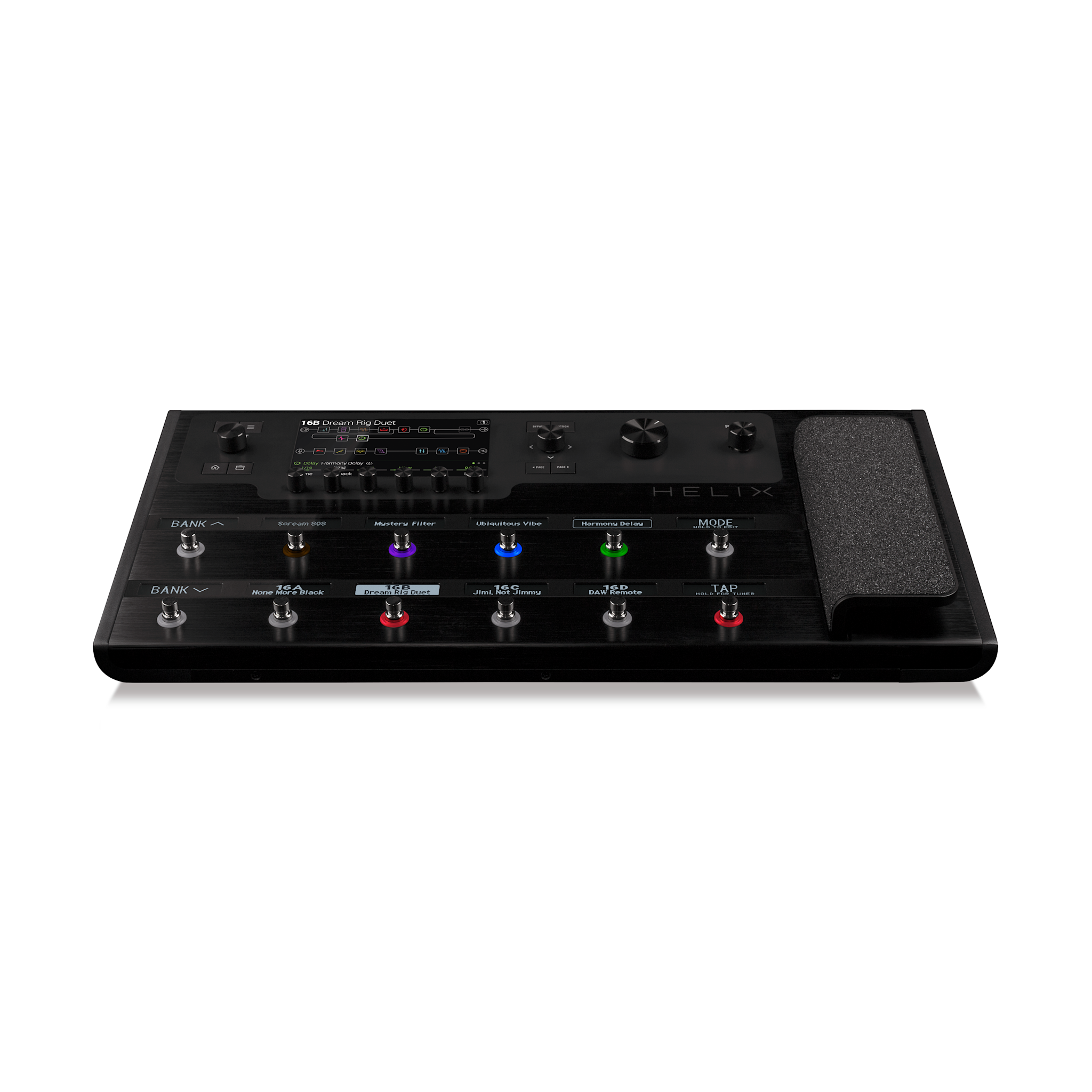 The built-in expression pedal controls volume, wah, or any parameter or combination of parameters. Hands-free Pedal Edit mode lets you edit any block parameter using your feet.
