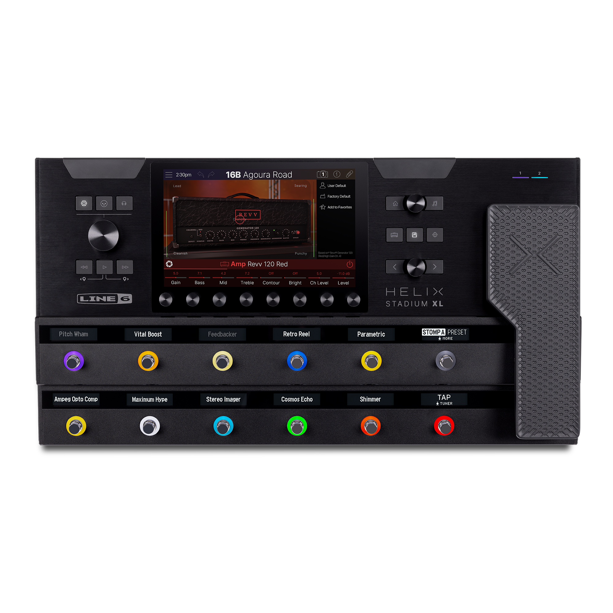 Helix Stadium XL Floor, the most comprehensive and integrated guitar processor ever created by Line 6. The extensive hardware package features a high-resolution 8" touch screen, 12 high-contrast OLED scribble strips, and a precise expression pedal with toe switch. It offers extensive connectivity, including various analog and digital audio inputs and outputs.