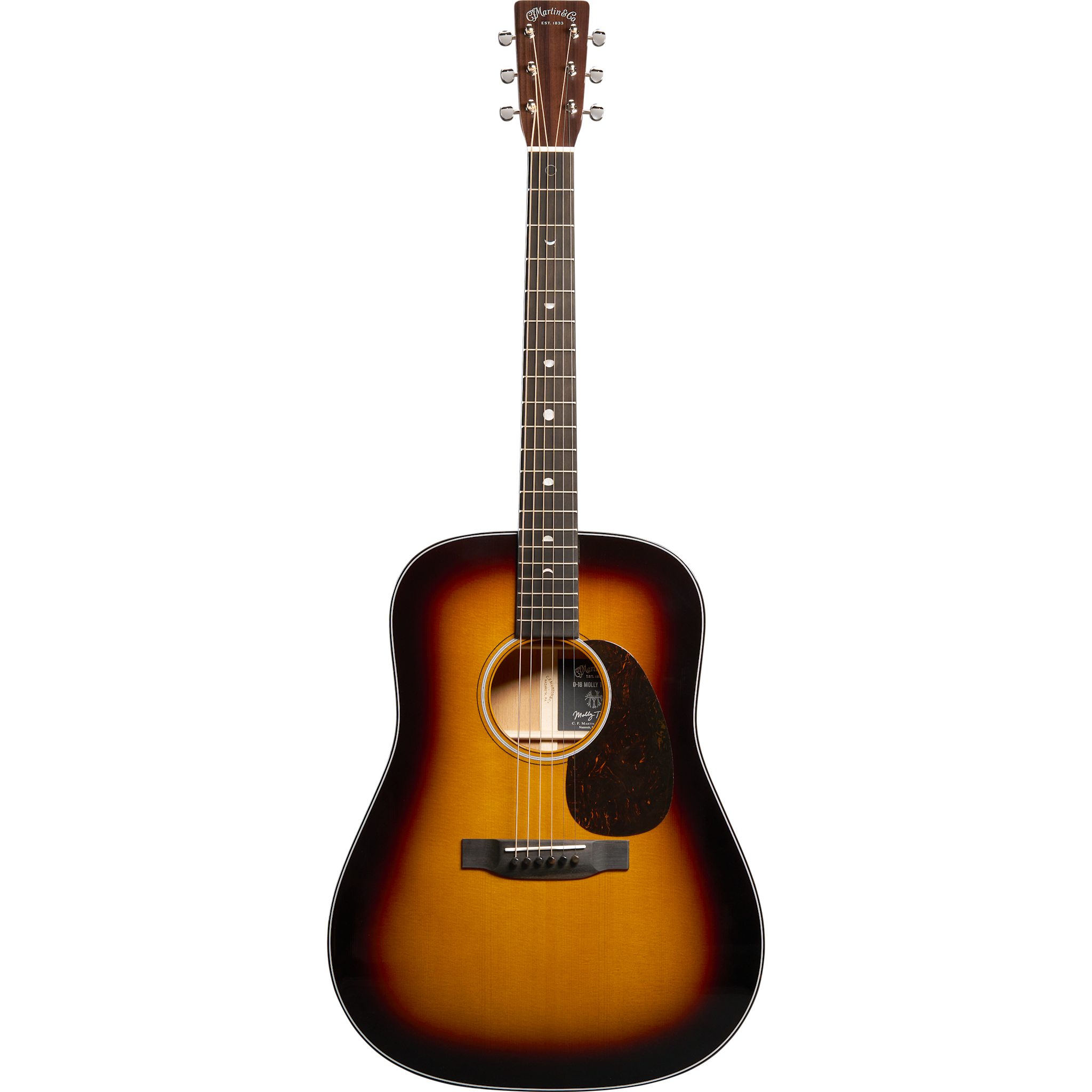 The Martin D-18 Molly Tuttle is built to honor both tradition and a trailblazing artist. Inspired by Molly’s own 1943 D-18, this signature model features rear-shifted scalloped bracing, a slim 1 11/16" nut width prized by bluegrass flatpickers, and an authentic 1940s neck profile. Unique details include custom moon phase inlays on the fingerboard, a silver Martin headplate logo, oval tuner buttons, and a vintage sunburst top—all paired with a vintage-style light blue molded hardshell case reminiscent of those issued in the 1970s. Crafted with a solid spruce top, solid mahogany back and sides, and ebony appointments, it offers the punch, clarity, and balance players expect from a D-18. A true artist model that reflects Molly’s style, sound, and vision.