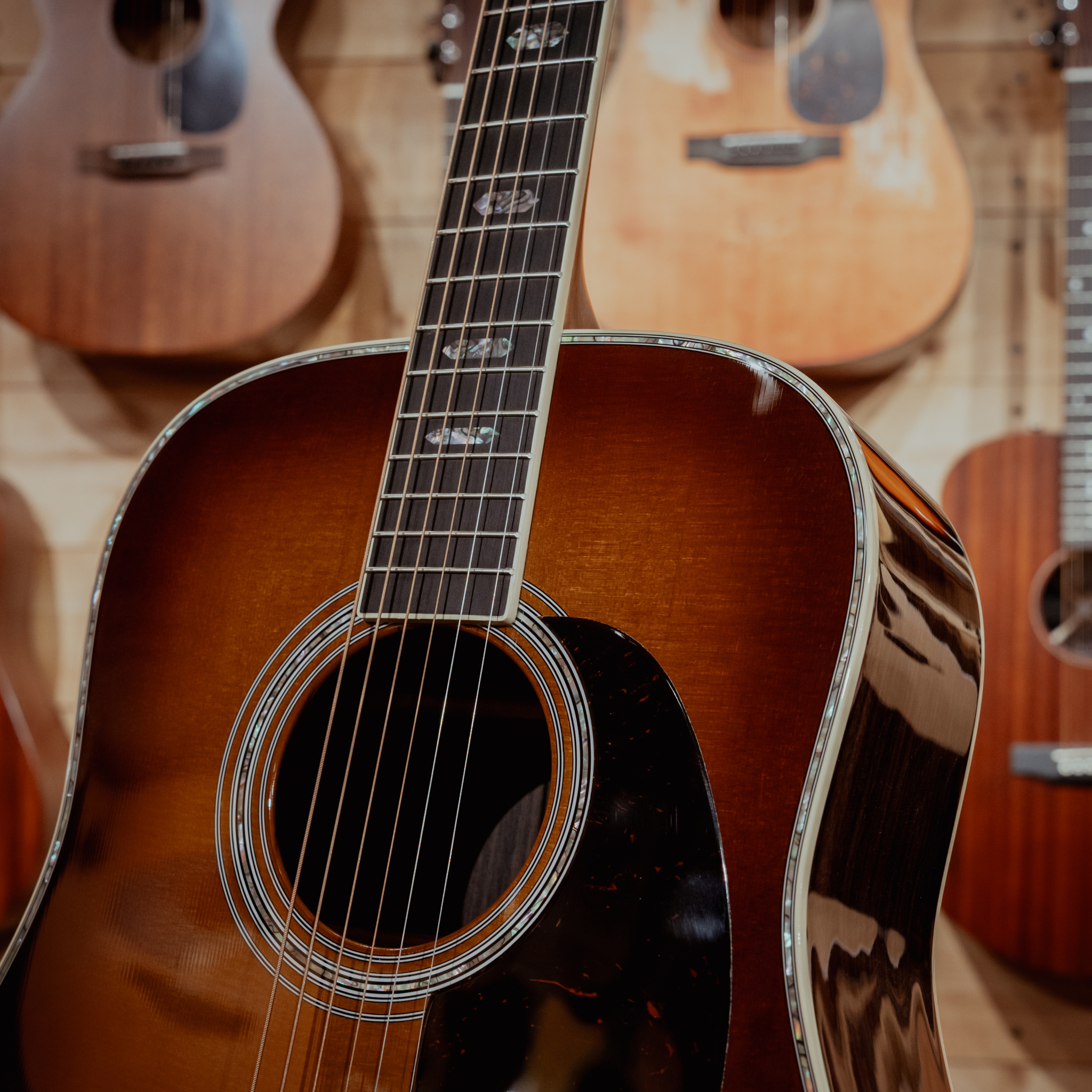 The Martin D-41 is a trusted icon in Martin’s acoustic lineup, blending powerful tone with refined elegance. Its Dreadnought body size delivers a bold, projective sound with strong bass, clear trebles, and rich overtones, making it ideal for players who want their music to fill the room. Handcrafted with a solid spruce top and solid East Indian rosewood back and sides, the D-41 offers a resonant voice that’s balanced across all playing styles. The satin genuine mahogany neck, featuring a Golden Era (GE) Modified Low Oval profile, high-performance taper, and 25.4" scale length, ensures smooth playability. Luxurious abalone details, including the rosette, top-edge trim, and hexagon inlays, elevate its timeless design. Complete with antique white binding, a bound ebony fingerboard, an ebony bridge with bone pins, gold open gear tuners, and a variety of striking gloss options, the D-41 is a guitar you can trust to unleash the artist within.