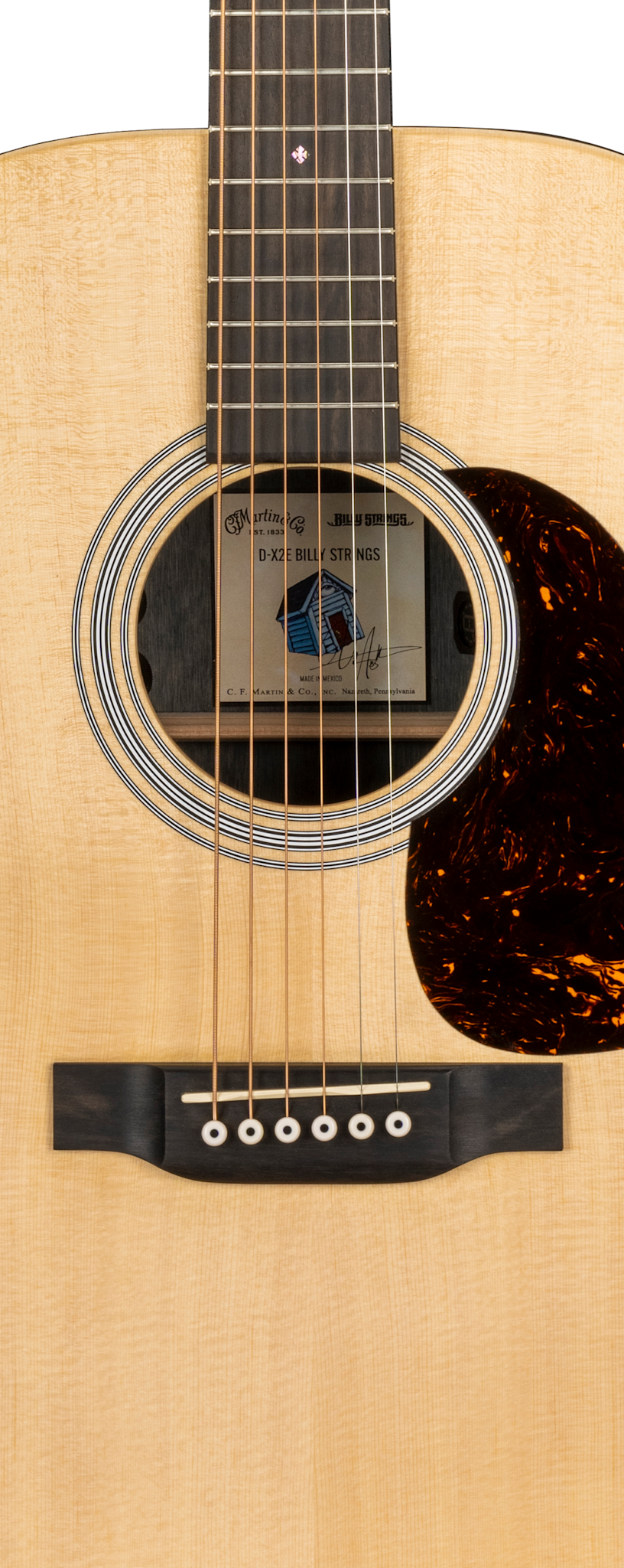 The Martin D-X2E Billy Strings takes inspiration from Billy’s love for his pre-war D-28 while offering a more accessible option for fans and players alike. It features the same unique 25” scale length and custom nut width as its high-end counterpart, making it easier to play fast, intricate lines while maintaining a comfortable feel. Built with durable Brazilian rosewood-patterned HPL back and sides and a solid spruce top, this Dreadnought delivers a powerful, booming tone that's perfect for both traditional and modern acoustic styles. Nickel open gear tuners, an ebony fingerboard with faux abalone inlay, and a style 28 rosette add a classic touch, while Martin E1 electronics and a built-in tuner ensure it's ready for the stage. Complete with a hemp softshell case, the D-X2E Billy Strings is a rugged, reliable instrument that reflects his passion for pushing boundaries and blending genres. Each guitar features a custom paper label with Billy’s pre-printed signature and graphic.