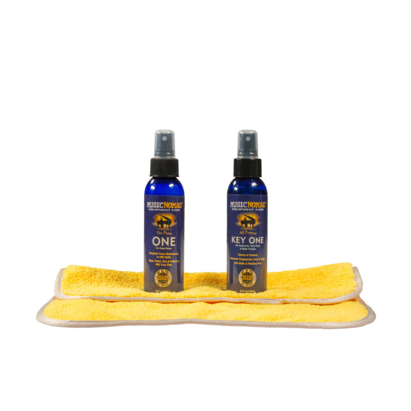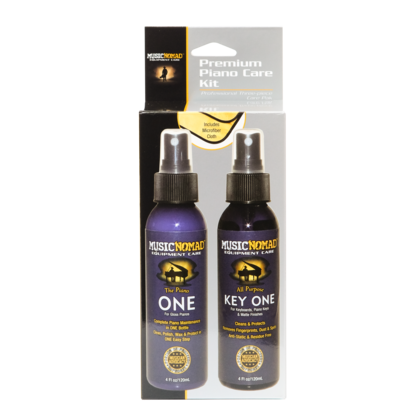 MusicNomad's Premium Piano Care Kit comes with everything you need to care for your piano. MusicNomad's Piano ONE is organically formulated to clean, polish, wax and protect gloss pianos. The first one-step answer for achieving a showroom shine, this formula is infused with white Brazilian carnauba wax to deliver a transparent, protective shield on your finish. Safe on all semi- and high-gloss finishes, we even added UV protectants and anti-static agents. MusicNomad's All Purpose Key ONE cleaner is everything you need to maintain your piano keys in one easy step-simply spray and wipe. This formula is safe on all piano keys and a single spritz cleans fingerprints, dust, and smudges like no other product. Streak free and residue free, it leaves a beautiful, clean surface with anti-static agents to help reduce the attraction and binding of dust. MusicNomad's Dusting and Polishing Cloth prolongs that fresh from the showroom feel for your piano. This 12" x 12" microfiber cloth features a revolutionary material containing 90,000 cleaning microfibers per square inch. The plush higher pile side is designed to lift and trap dust away from the surface. After removing the dust, flip the cloth over to the lower pile cloth side and use with MusicNomad revolutionary cleaners and polishes to clean and restore the surface's original finish. That's MusicNomad quality - raising the bar in equipment care.