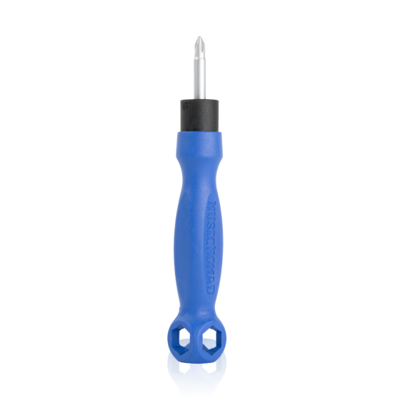 Forget lugging around a bunch of screwdrivers, nut drivers & wrenches when The Octopus 8 'n 1 Tech Tool can handle the job! MusicNomad's patent pending, innovative design is perfect for tightening or loosening output jacks, strap locks, control pots, tuning machine bushings & screws. It features both a Phillips & flat blade screwdriver with our reversible shaft design and is engineered for the most popular hex wrench sizes: 10mm, 12mm, 14mm, 1/2" & 7/16". Remove the screwdriver and use the 1/2" narrow profile hex wrench for tightening sunken pots and Tele cups. Just say no to metal. Our hex wrenches are made with strong ballistic nylon material that can handle any job without the worry of scratching your hardware or finish. Small in size but big in results our 6"/15cm overall length is a must have for every guitar case.