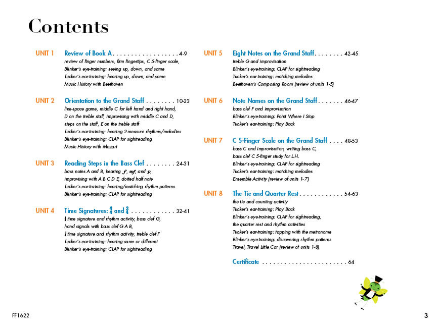 64 pages of fun-filled activities support the music learning process. Reading steps on the staff is a primary focus of Book B. The inventive Writing Book guides young players in reading, hearing and creating with steps on the Grand Staff. Teachers will welcome the special “C.L.A.P. for Sightreading” pages, designed to reinforce and celebrate note-reading. Students touch on music history with Mozart's and Beethoven's Fun Facts and Games and take a peek into Beethoven's Composing Room. Tucker, Blinker and Tap return with ear-training, sightreading, and rhythm fun. Then there is also the Tooth Fairy Visit, Rhythm Beads, Escape of the Quarter Notes... and much more.