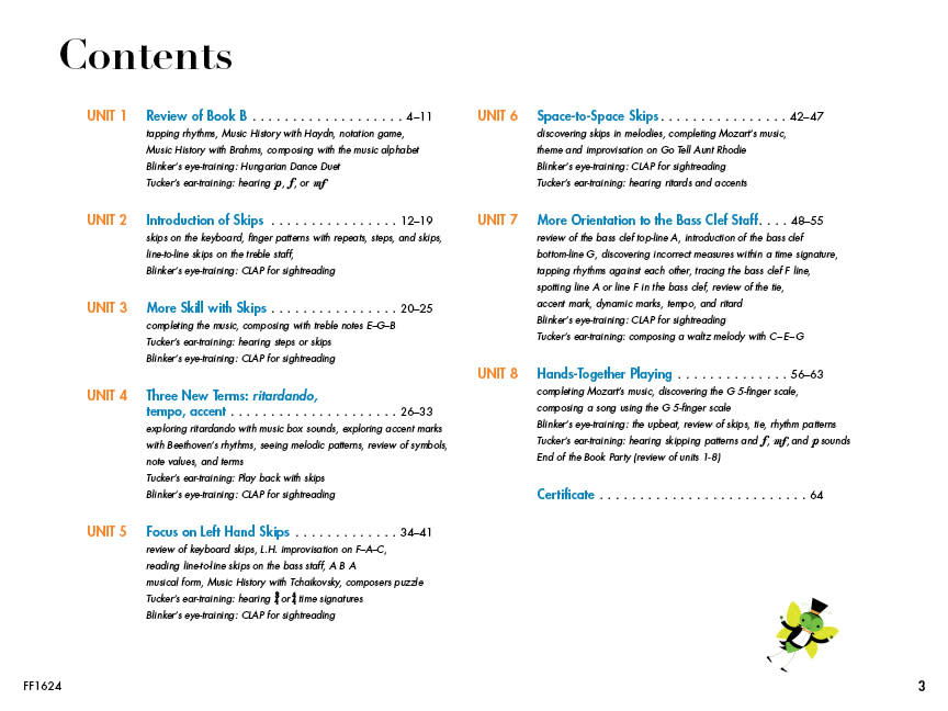 Writing Book C (the companion book for Lesson Book C) provides 64 colorful, fun-filled pages of writing, ear-training, and “CLAP for Sightreading” activities. A focus on reading skips leads students to cross bridges, connect flags, meet a mouse, and skip to deep-sea treasures, to name just a few! Writing Book C engages children in the lives and melodies of classical composers introduced in the Lesson Book C. Take part in Haydn's Fun Facts and Game, make after-dinner music with Mozart, tap Beethoven's rhythms, and help Tchaikovsky tell the story of a doll with a broken arm. The valuable educational activities and vibrant illustrations of My First Piano Adventure ® are sure to delight the young beginner and teacher.