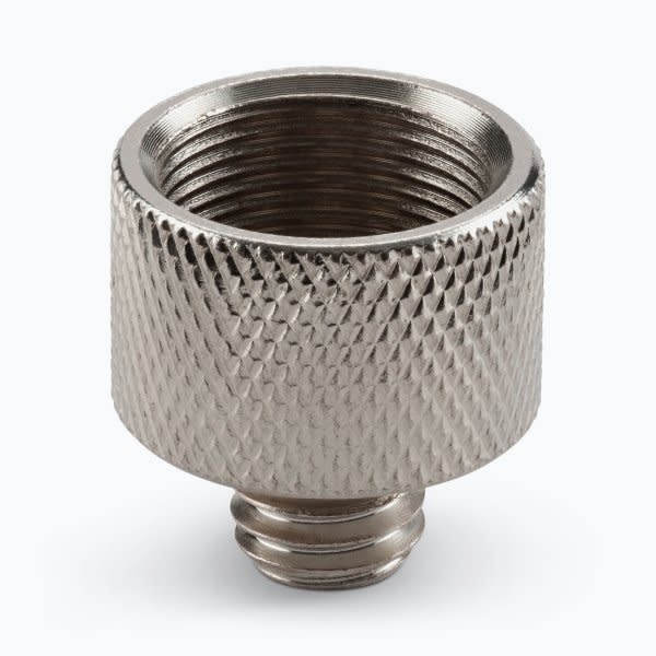 Now your standard mic stand can be a versatile tool that uses any European boom arm or mic accessory you choose. The MA-100 3/8" Male to 5/8" Female Mic Screw Adapter quickly and easily allows European booms and accessories to fit standard stands. This adapter features a knurled outer flange for ease of tightening and loosening. Chrome finish.