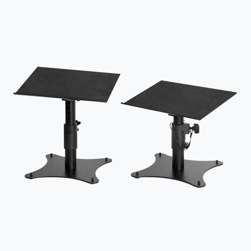 Perfect for mixing desks, this pair of SMS4500-P Desktop Monitor Stands provides stable support for small speakers while reducing tabletop rumble and soundwave reflections. Adjustable height and platform angle facilitate precise speaker placement to optimize sound in a variety of spaces. Padding on the platforms protects speaker cabinets and rubber feet on the bases dampen vibrations.
