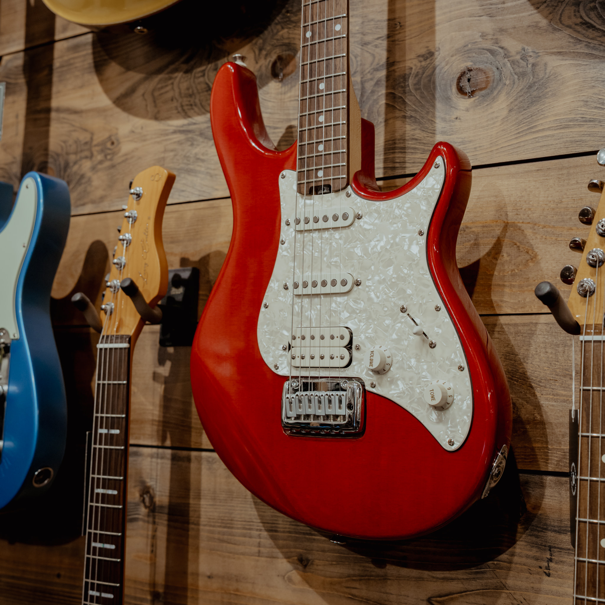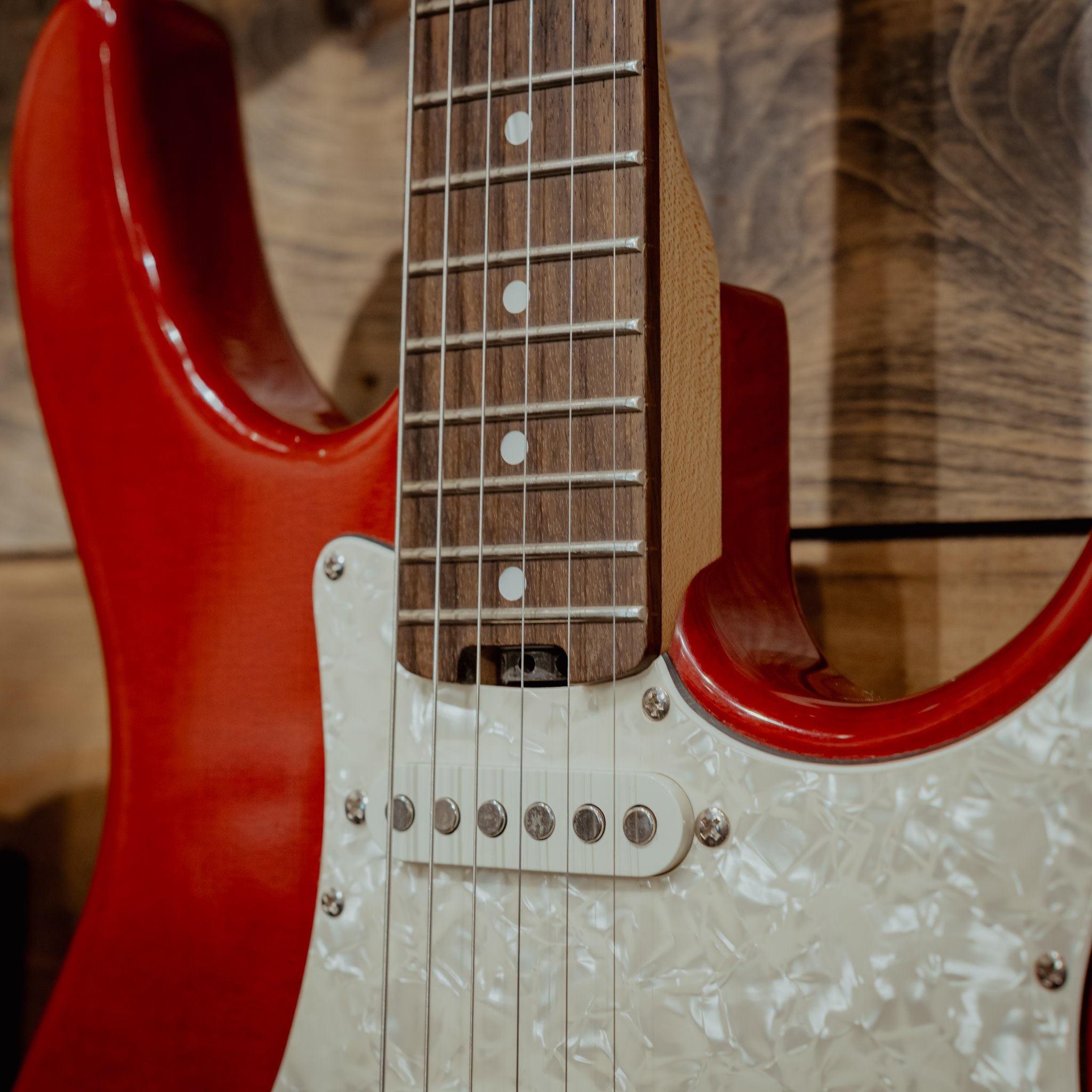 A used 90s Peavey Predator Plus Electric in Transparent Red in great condition. There are some knicks and pick rash but nothing out of the ordinary. The guitar plays great. Peavey Bag included.