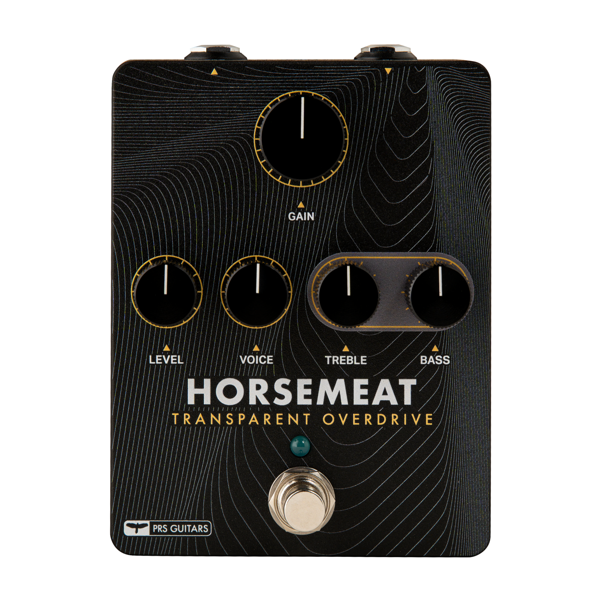 The PRS Horsemeat transparent overdrive pedal is designed to enhance your sound without coloring your tone. Horsemeat adds harmonic midrange richness and overdrives without cutting out your high notes – all while giving you more available headroom. It features a robust EQ section so you can dial in your tone and has a wide range of gain on tap. Depending on the setting, Horsemeat can be used as a clean boost, straight overdrive, or even enhance your amplifier’s distortion by slightly pushing the front end of the amplifier’s preamp section.