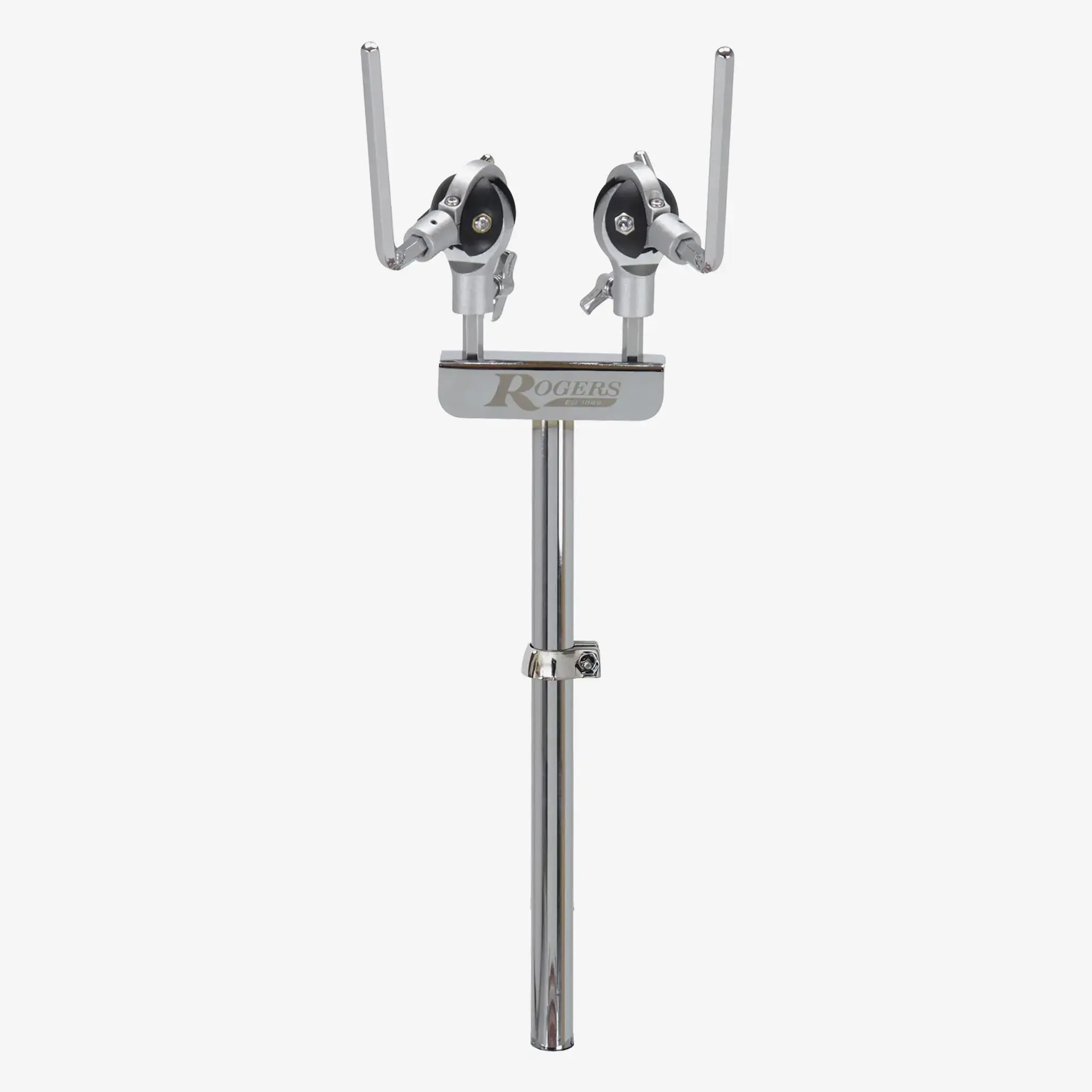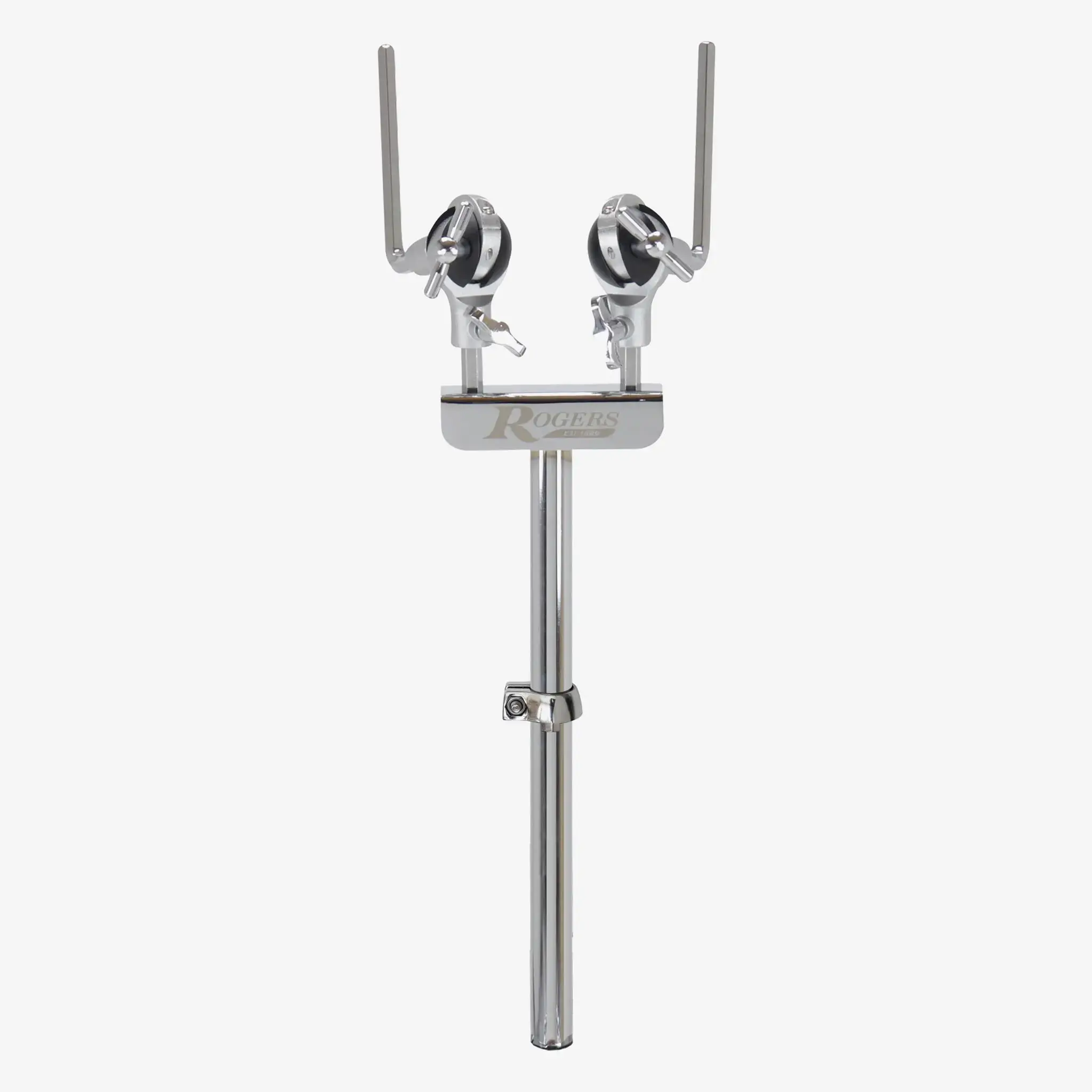 The RDH7439-DBL Ultra-Matic Double Tom Mount is a modern redesign of Rogers’ bass drum-mounted original (Londoner style). Engineered for fast and exact tom positioning, this new mount features a pair of Rogers hand-adjustable, Ultra-Matic 3/8 inch hex ball-joint tom arms. Both arms offer independent rotation adjustment on a solid T-bar platform with a 15 inch long 7/8 inch diameter down tube.