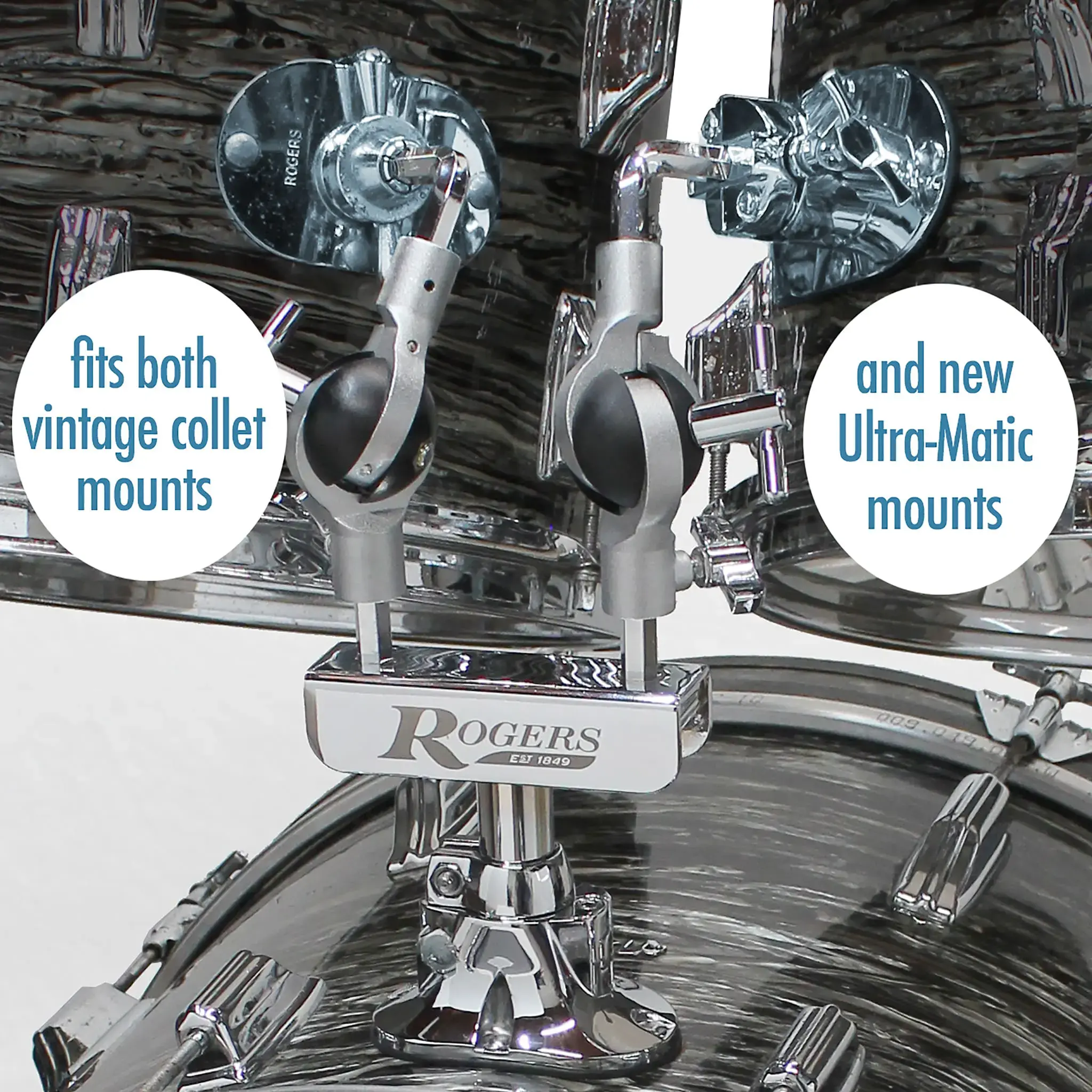 The Ultra-Matic Double Tom Mount is designed to be used with the Rogers RDH3249-BD, 7/8 inch Bass Drum Mounting bracket for precise mounting to a bass drum. As an original equipment upgrade, the mounting plate dimensions of the RDH3249-BD is the identical to most original Rogers, oval plate bass drum mounts (366 “Londoner” Double Tom Holder or 365R “TopHat” Twin Tom Holder). Also, the 3/8 inch hex tom arms are Rogers standard, and will mount to vintage collet tom brackets, as well as current Rogers tom mounting brackets.
