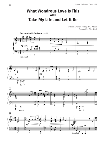 Arranger Alex-Zsolt has always been inspired by the rich texts and melodies of the traditional hymns. This collection includes uplifting arrangements of many beloved hymns. Titles: All Creatures of Our God and King (with Rejoice, the Lord Is King, and All Hail the Power of Jesus' Name) * At Calvary * The Church's One Foundation * Come, Christians, Join to Sing * Grace Greater Than Our Sin (with Amazing Grace) * Immortal, Invisible, God Only Wise * A Mighty Fortress Is Our God * Praise to the Lord, the Almighty * This Is My Father's World * What Wondrous Love Is This (with Take My Life and Let It Be).