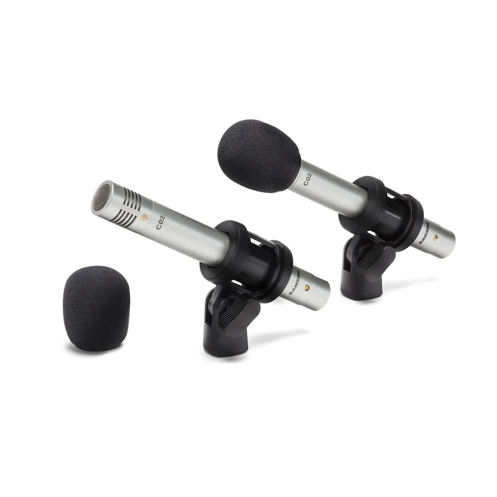 Packaged in a protective carrying case, each C02 microphone comes with a proprietary shock-mounted microphone clip that provides maximum isolation from vibration while minimizing noise. In addition, the two included foam windscreens can be fitted to significantly reduce wind noise in outdoor applications or to reduce plosive sounds in vocal applications.