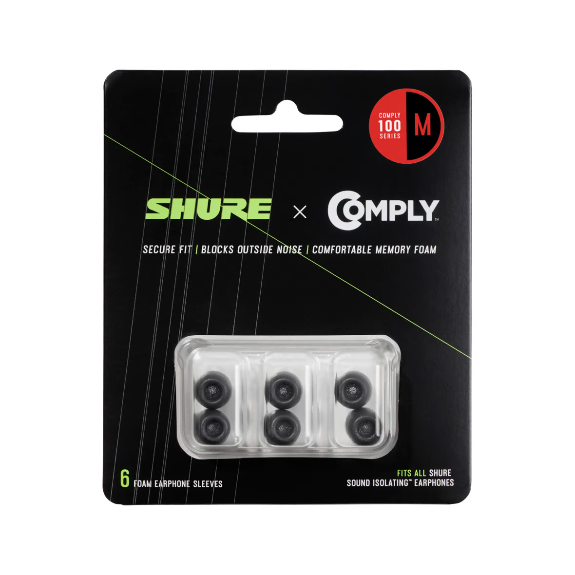 Replacement Comply (100-Series) foam sleeves for Shure Sound Isolating™ Earphones. Soft memory foam tips block out noise and make listening more comfortable, stable and immersive. Set of 6 (3-pair).