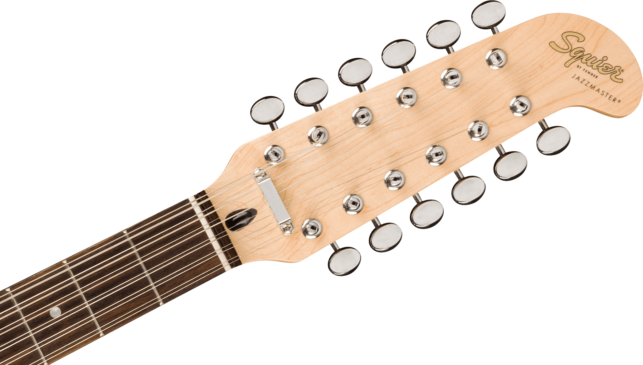 With its iconic offset body shape and rich harmonic character, the Squier® Jazzmaster® XII encourages the most adventurous players to chart a new course of guitar exploration. Featuring dual Fender-Designed alnico single-coil Jazzmaster pickups with 3-way switching and a vintage-inspired "hockey stick" headstock design, this 12-string model doubles down on chime-y tones and timeless style. Other player-friendly details include a graphite-reinforced "C"-shape neck for optimal stability and easy playability, a hybrid string-through-body/top-load bridge for reliable intonation, vintage-style tuning machines for smooth tuning action, and a gloss neck finish for a slick yet confident feel.