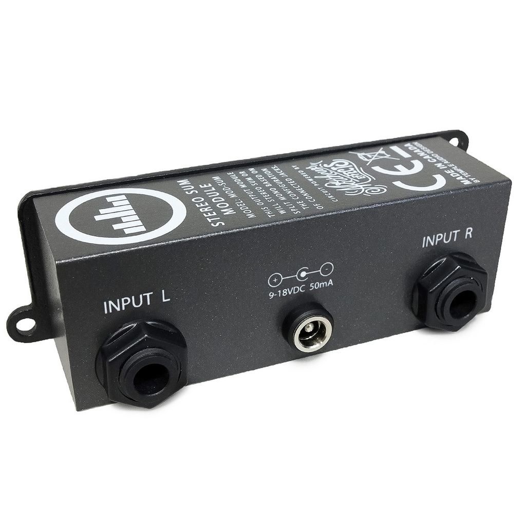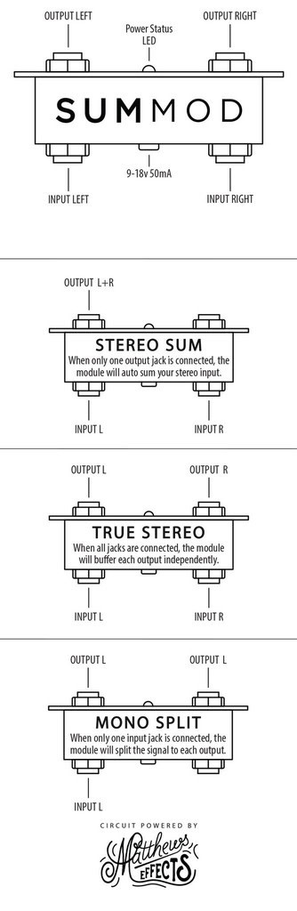 The SUM MOD is a stereo output module that uses two independent buffers (powered by Matthew Effects) to bring life back to long chains of cables/pedals. It can also be cofigured to split a mono signal to two mono outputs or sum your stereo signal to a single mono out (i.e. when you only have one amp/DI).